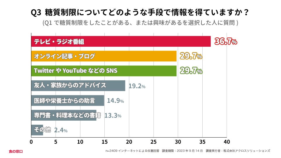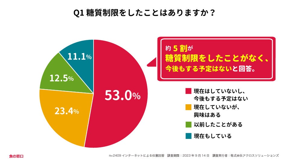 そこで、株式会社アクロスソリューションズと一般社団法人 日本唐揚協会が共同運営している食の窓口(URL:https://karaage.ne.jp/contents/ )は、20歳〜60歳以上の男女2409人を対象に「糖質制限に関するアンケート調査」を実施しました。