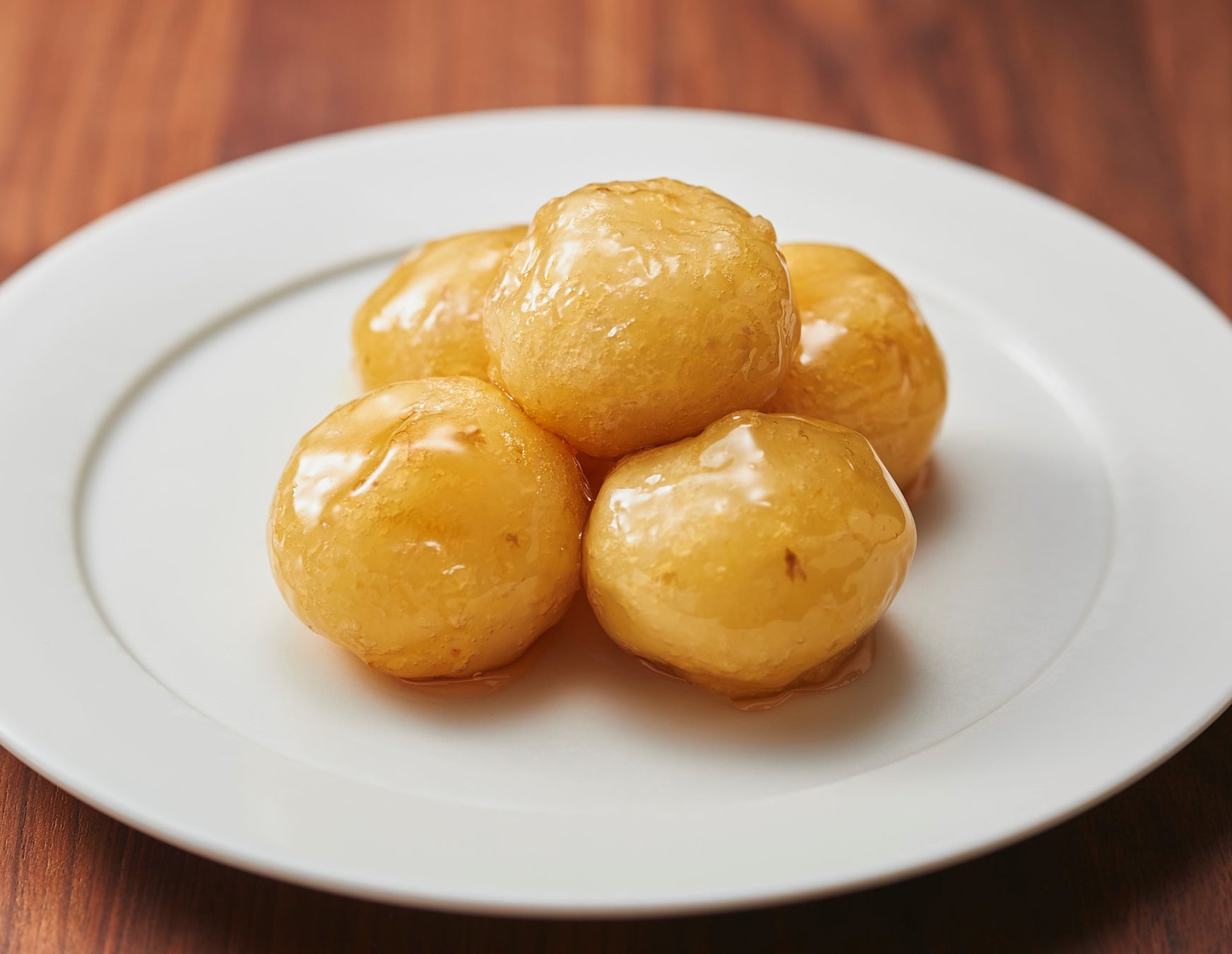香ばしい揚げじゃがいもの風味に、メープルシロップがほんのり香る甘いたれを絡めた、もちもち食感の甘辛味。お月見シーズンにちなんだおやつにぴったりのじゃがいももちです。
