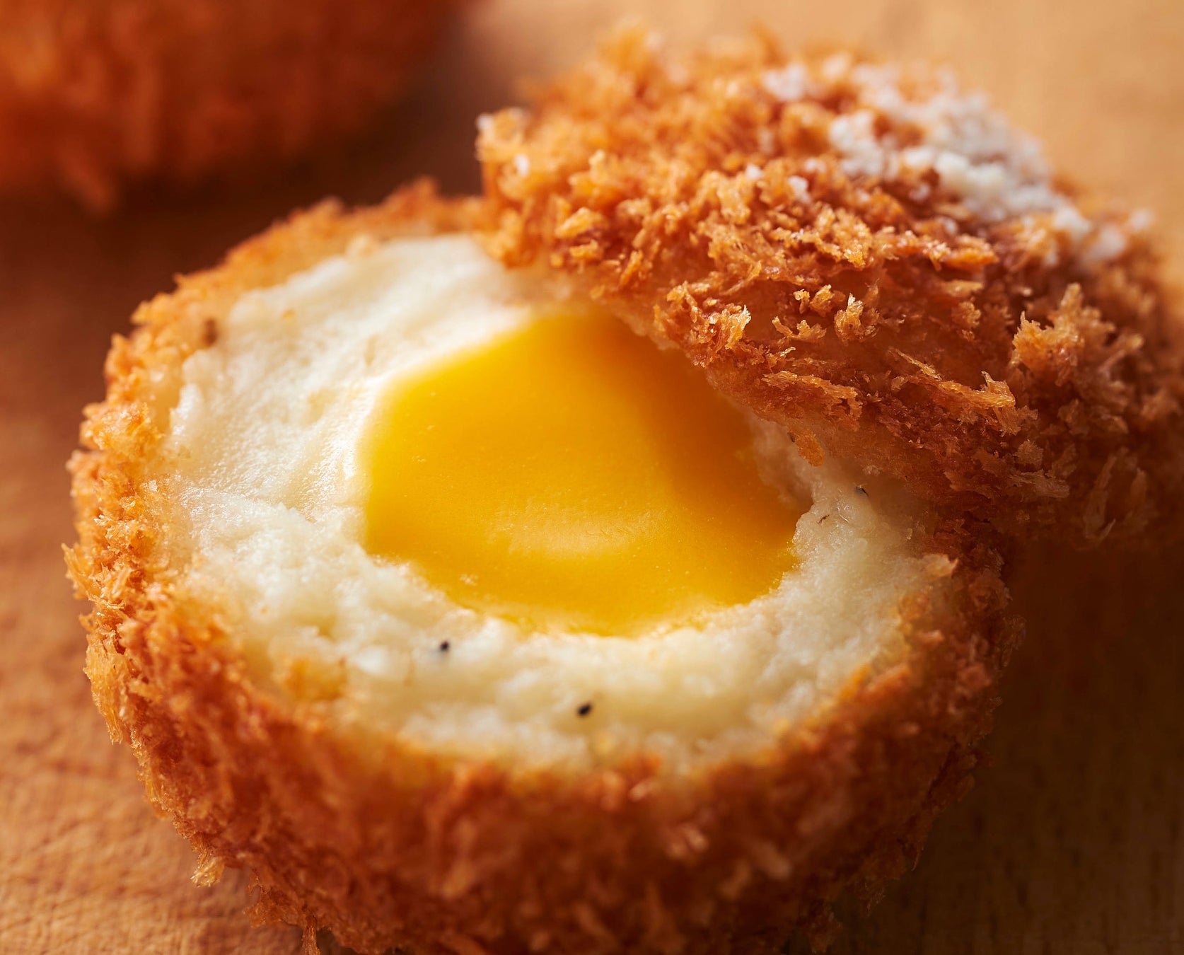 レッドチェダー、ゴーダ、グリュイエール、モッツァレラ(ミックスチーズ)、パルミジャーノ・レッジャーノの5種類をブレンドした食べやすい味わいのチーズを、甘味のあるポテトで包みました。電子レンジで温めると黄色いチーズがとろけだす、味も見た目も楽しめるコロッケです。