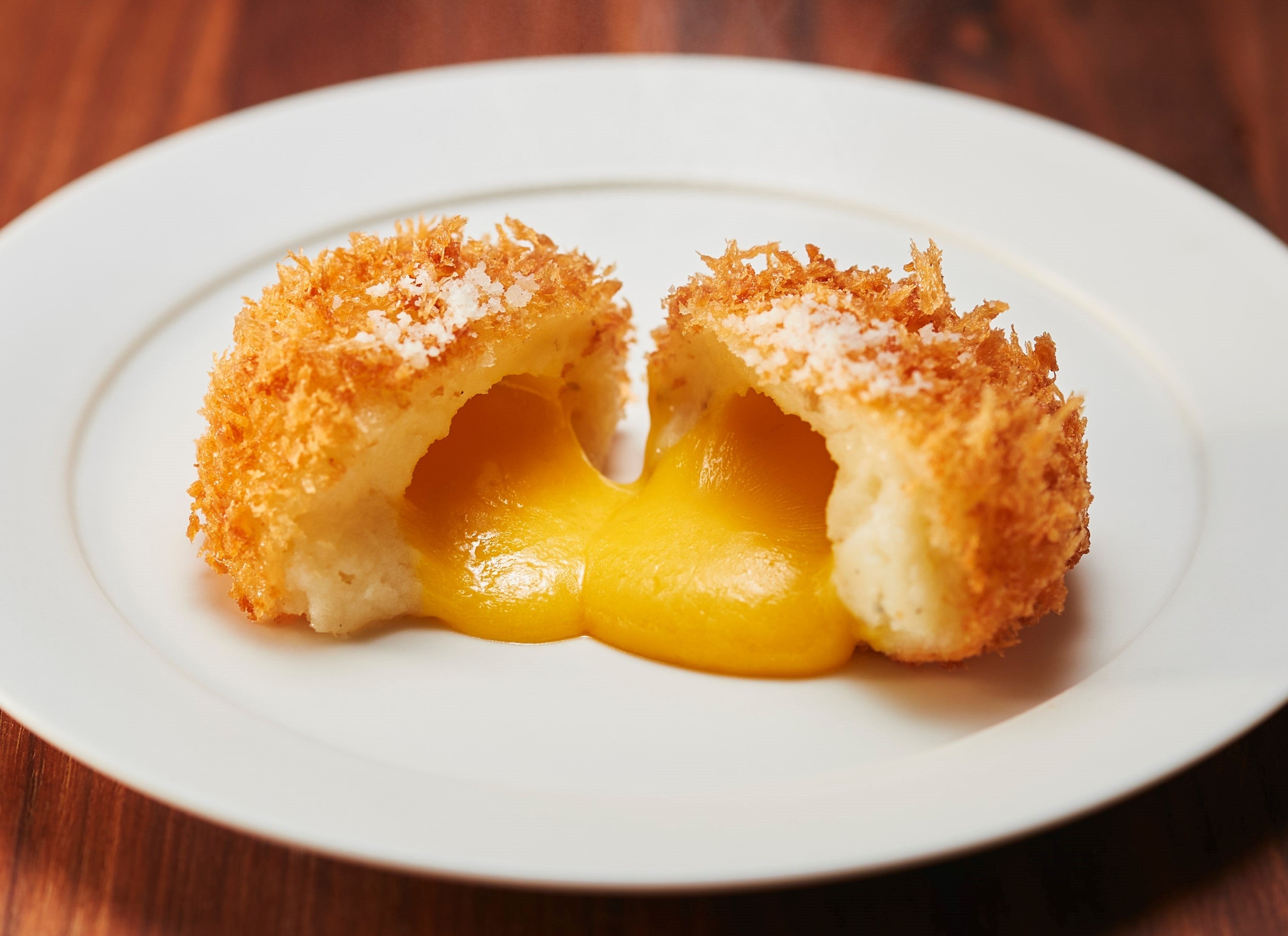 レッドチェダー、ゴーダ、グリュイエール、モッツァレラ(ミックスチーズ)、パルミジャーノ・レッジャーノの5種類をブレンドした食べやすい味わいのチーズを、甘味のあるポテトで包みました。電子レンジで温めると黄色いチーズがとろけだす、味も見た目も楽しめるコロッケです。
