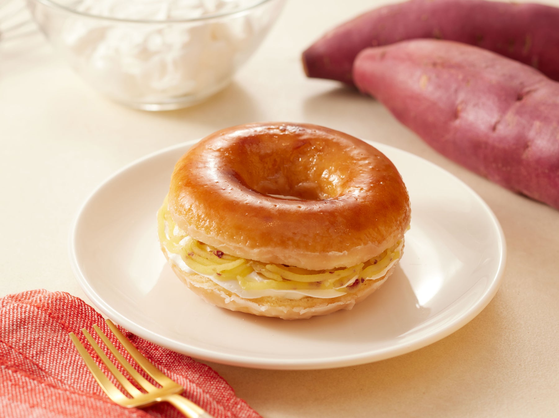 オリジナル・グレーズド®の表面を焦がしてカリッとキャラメリゼ。 徳島県産なると金時餡とホイップクリームをタブルで絞り、贅沢にサンドしました。 こんがり香ばしいグレーズとほっくりとしたさつまいもが絶妙にマッチした、 大人スイートな味わいです。 |