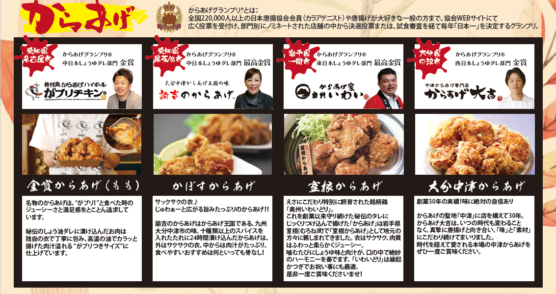 「がブリチキン。」は、日本で一番美味しいからあげを決定する「からあげグランプリⓇ」で12年連続金賞を受賞。からあげの美味しさを一人でも多くのお客様にお届けしたいと、環境の変化に合わせてお客様のニーズに対応すべく、従来の”バル・居酒屋”といったアルコール業態に加え、”テイクアウト専門店”、”フードコート”、”キッチンカー”などの業態も展開しています。