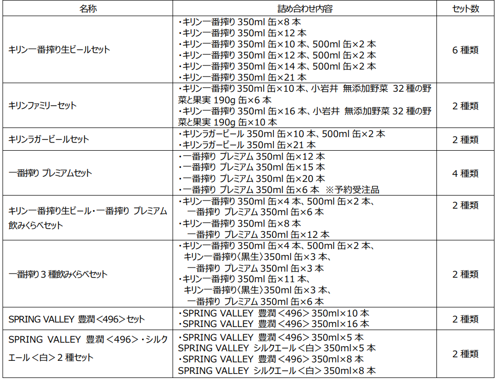今年も、おいしさで人気の「キリン一番搾り生ビールセット」に加え、第一等品東北産ホップをふんだんに使用した「一番搾りプレミアム」や、「一番搾り」の黒ビールである「キリン一番搾り〈黒生〉」など、人気の「一番搾り」シリーズを楽しめるアソートセットを発売します。また、直近のクラフトビールのニーズの高まり※を踏まえ、クラフトビール「SPRING VALLEY豊潤<496>」・「SPRING VALLEYシルクエール<白>」が入った「SPRING VALLEY豊潤<496>・シルクエール<白>2種セット」なども展開します。さらに、清涼飲料を含むファミリーギフトに「小岩井 無添加野菜 32種の野菜と果実」を新たに採用しました。