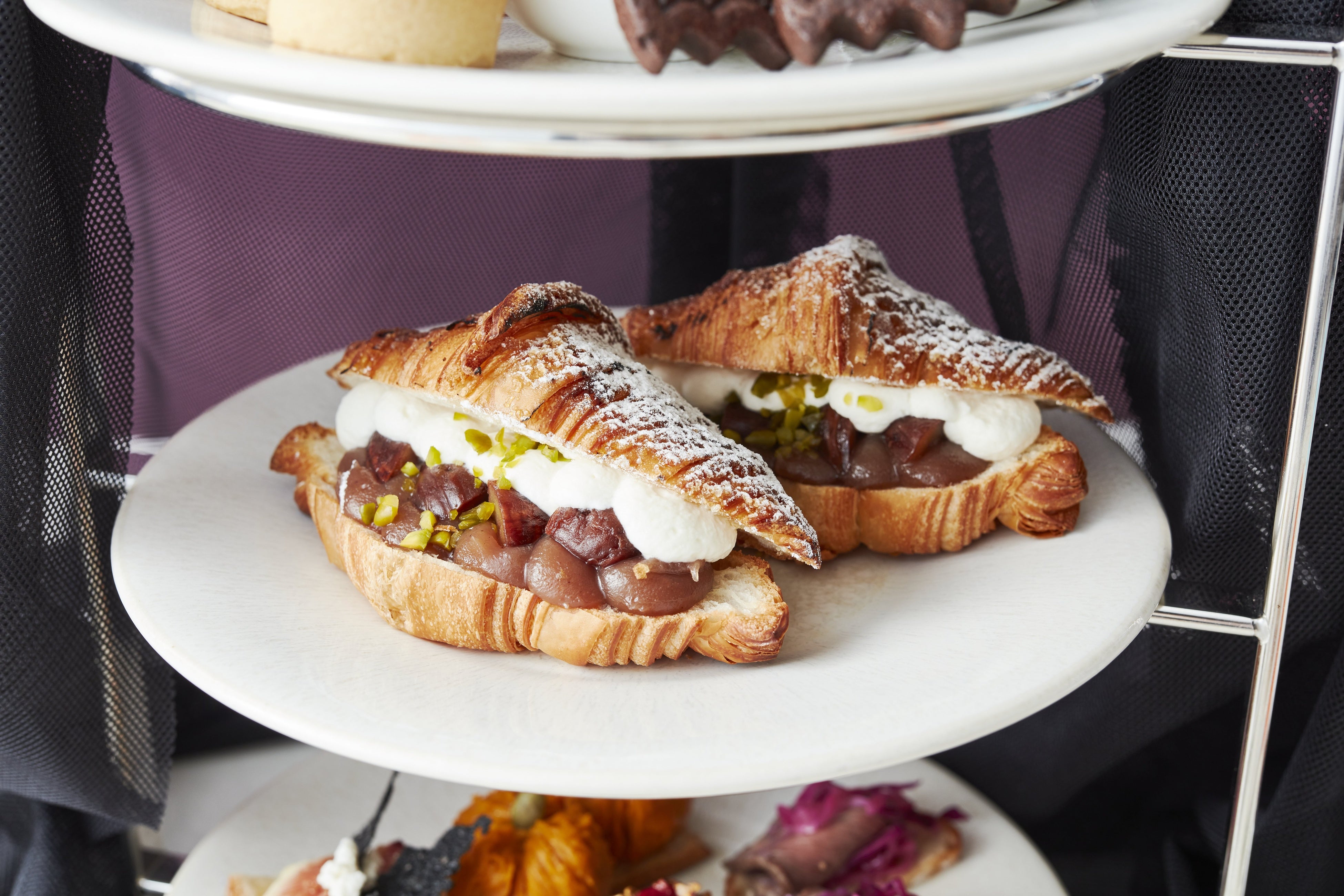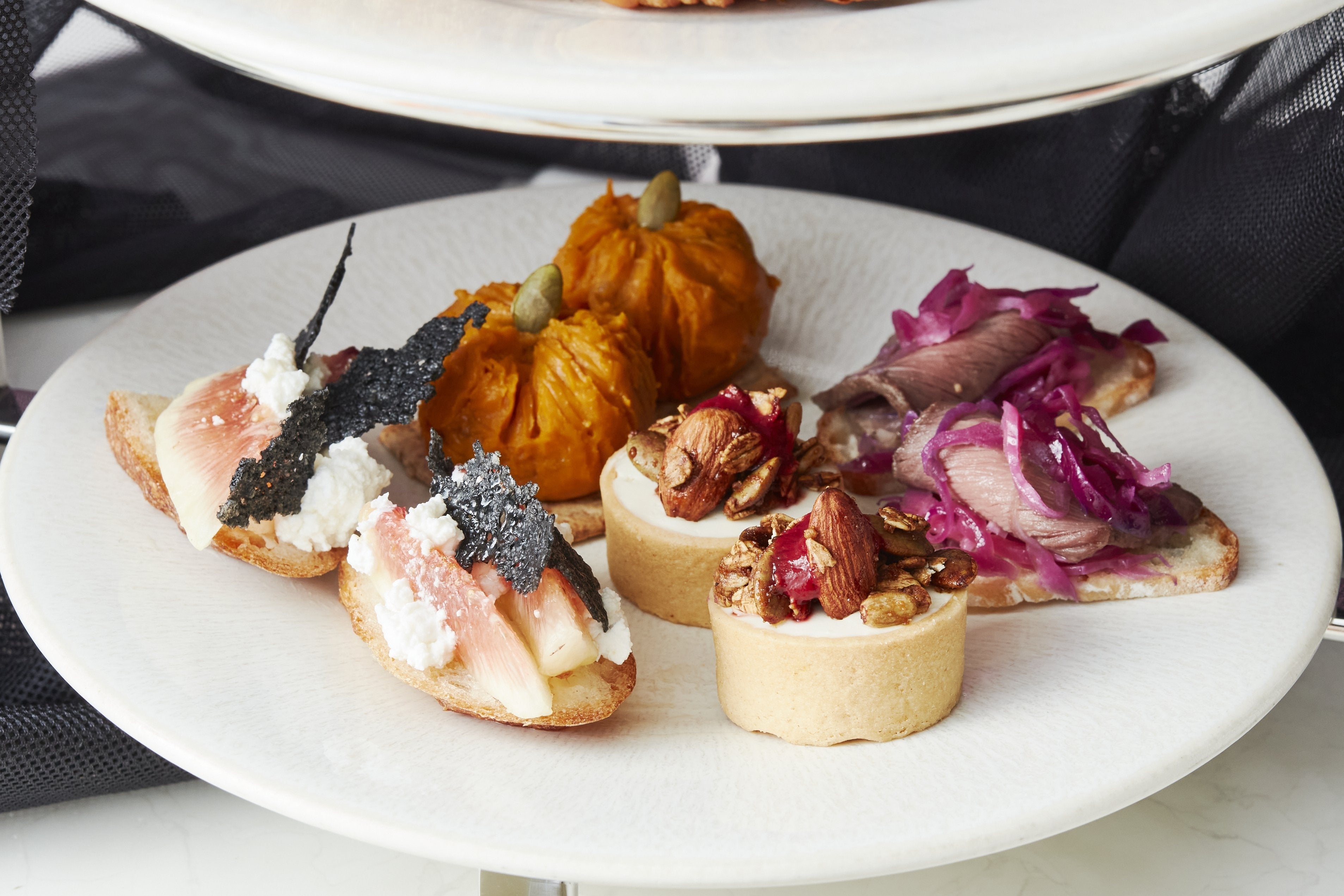 また下段のセイボリーには、無花果とカッテージチーズをバケットに乗せて蜂蜜をかけたタルティーヌ、かぼちゃの形が可愛らしいミニサラダ、ローストビーフと紫キャベツのマリネ、ナッツとベリーのクリームチーズタルトが並びます。