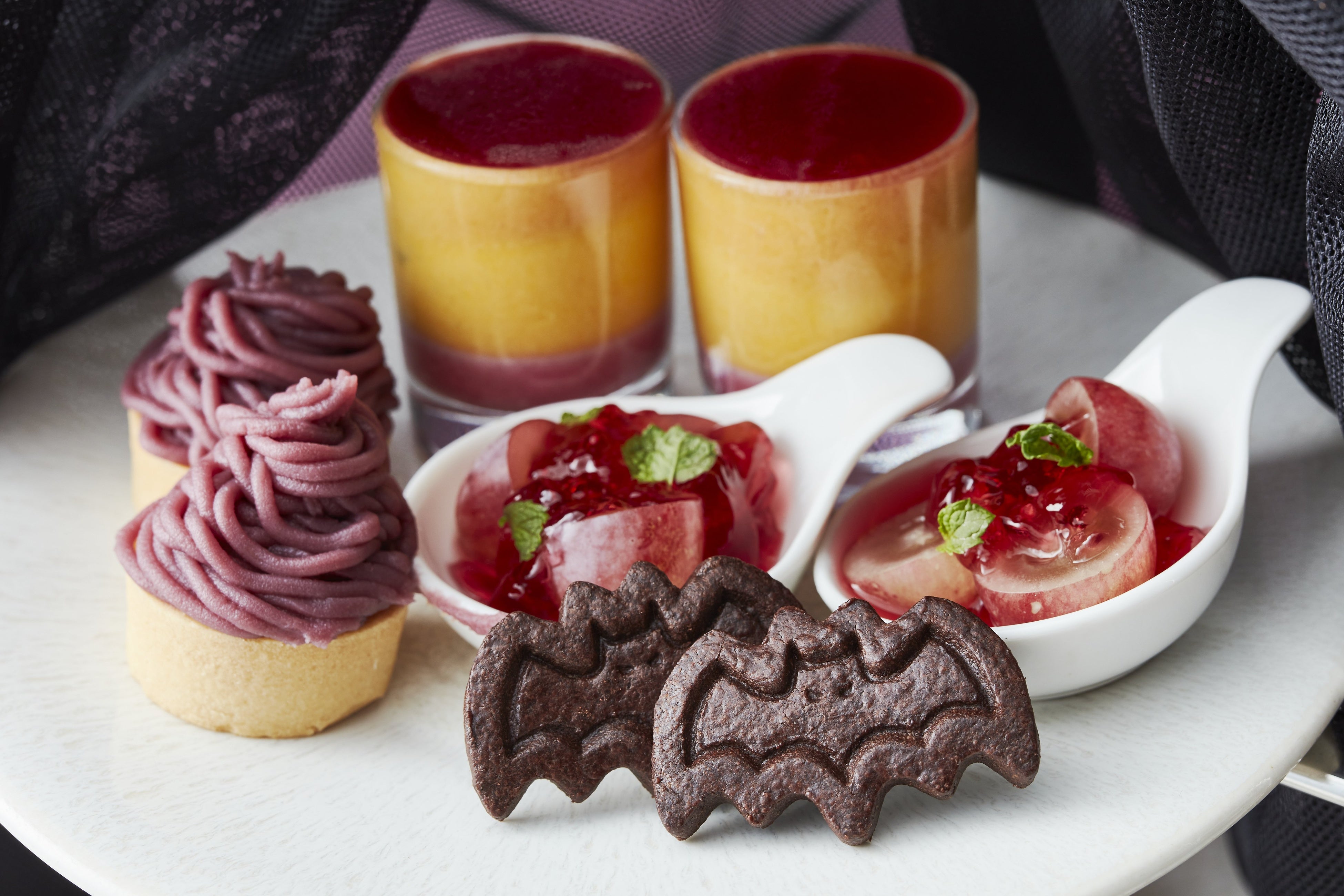 紫芋モンブラン、かぼちゃとカシスのムース、ハロウィンクッキー、葡萄とミントのクランベリーゼリー