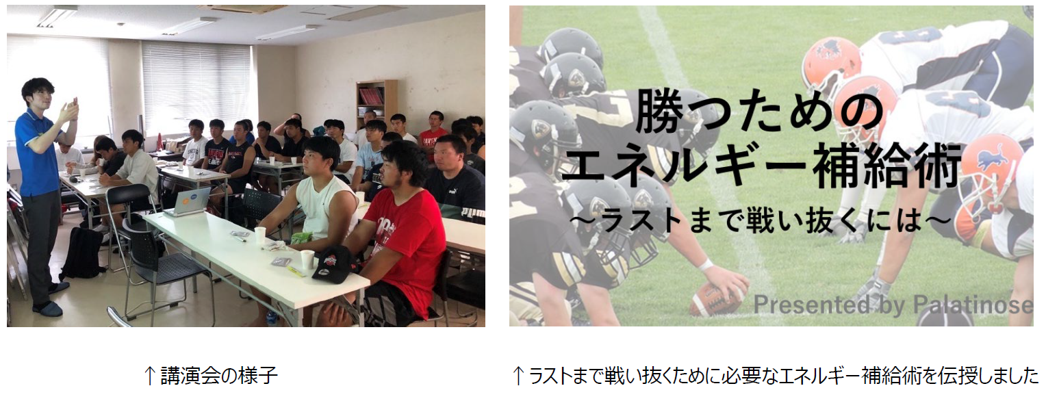 DM三井製糖はアメリカンフットボールをはじめ、ラグビーや水泳、野球、マラソンなど様々なスポーツ分野の大学スポーツチームやプロスポーツチームをエネルギー面でサポートしていきたいと考えており、糖質・エネルギーに関する講演会やパラチノース®の試飲会を実施していきます。事前のアンケート調査などでチームの抱えるエネルギー面の課題についても分析・フィードバックが可能です。講演会や試飲会などのご要望がございましたら、下記連絡先までご依頼ください。