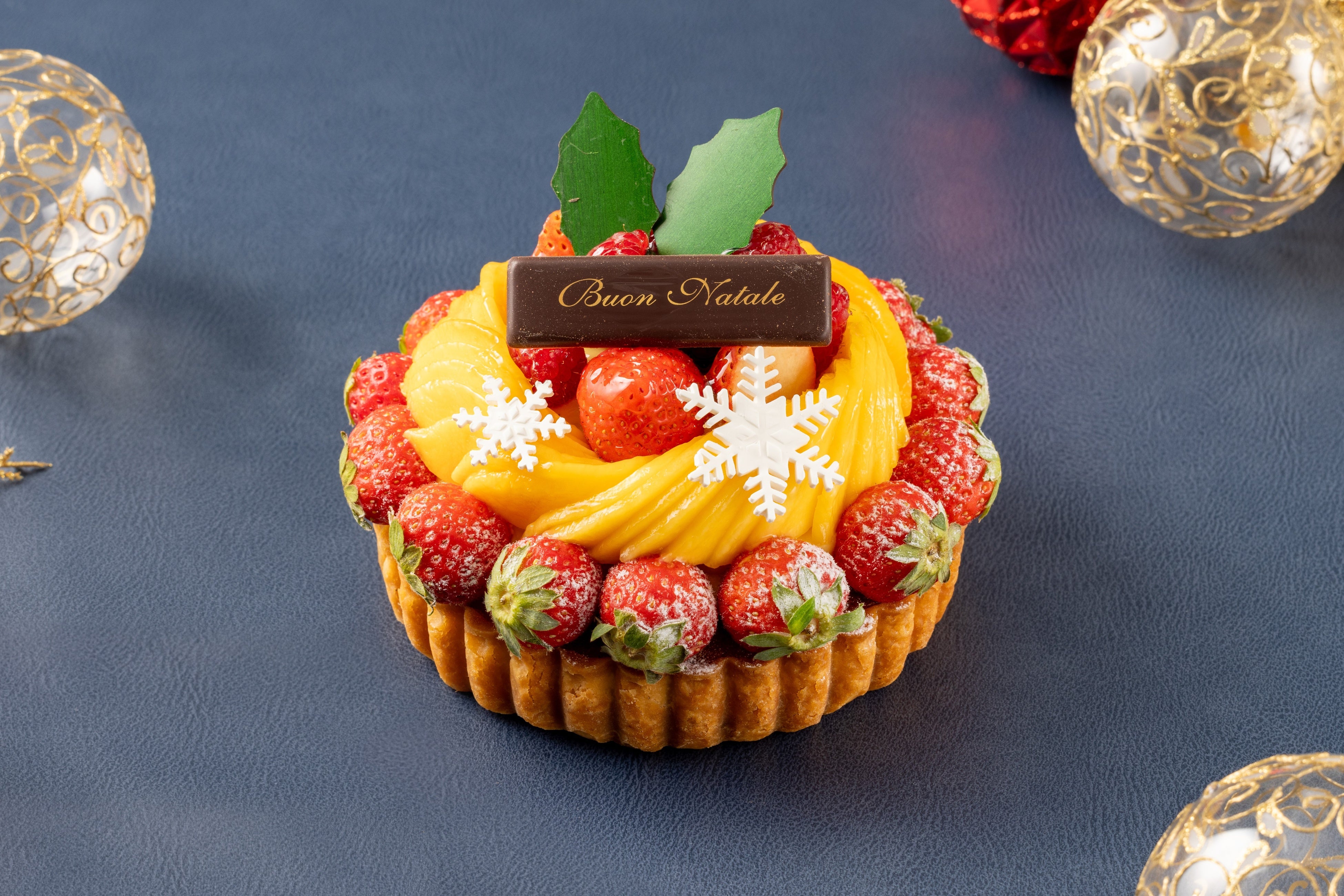 色鮮やかなフルーツをたっぷりとトッピングしたフルーツタルト。サクっと歯ざわりの良いタルト生地にはヘーゼルナッツとアーモンドの風味豊かなクレームダマンド、爽やかなアクセントとなるオレンジのジャムを重ねています。たっぷりの鮮やかなフルーツで、ホリデーシーズンらしく華やかに仕上げました。