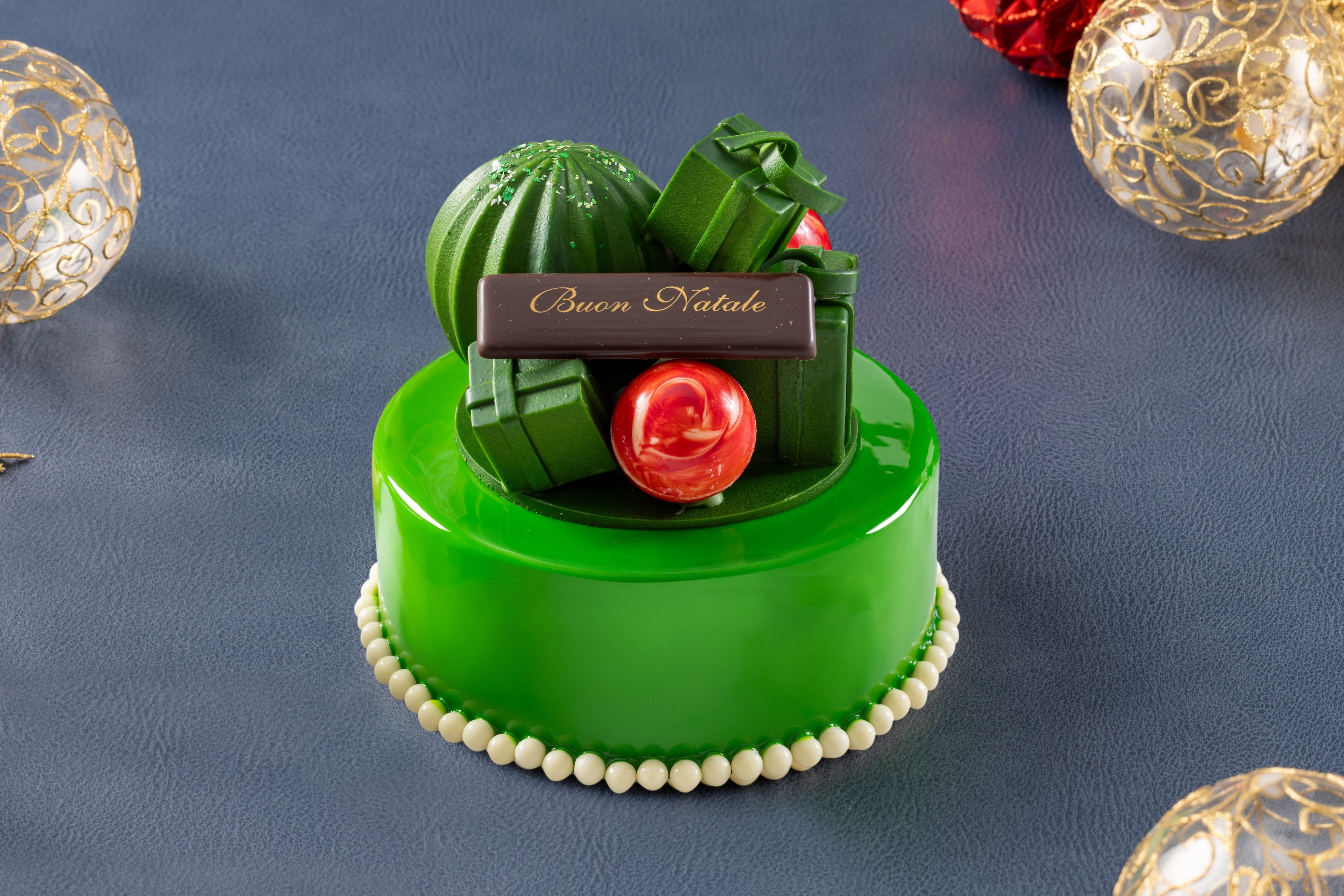 クリスマスのわくわく感をさらに盛り上げる鮮やかなグリーンを基調にしたピスタチオムースケーキ。ピスタチオ、ビスキュイ、薄く焼いたクレープ生地を細かく砕いたフィアンティーヌ、ホテルオリジナルのチョコレート「Grande H」のクリーム、ラズベリージュレを丁寧に重ね、ピスタチオのムースで包み込みました。華やかなビジュアルでありながら、香ばしいピスタチオの風味を生かした繊細な味わいです。