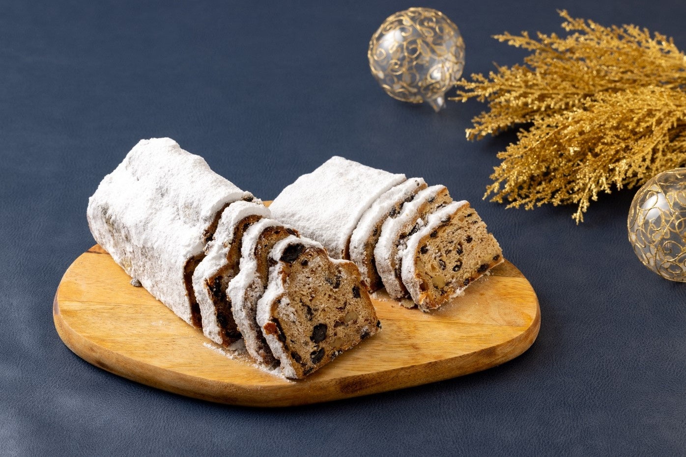 一切れずつカットして食べながらクリスマス当日までカウントダウンをするといわれる、ドイツの代表的なクリスマスブレッドのシュトーレン。ラム酒に3ヶ月以上漬け込んだドライフルーツ(2種のレーズン・オレンジ・レモン・クランベリー)やくるみ・アーモンドをたっぷり生地に練り込みしっとりと焼き上げました。ラム酒の香り、ドライフルーツとナッツの食感がアクセントになっています。シュガーパウダーが染み込んできた頃が食べ頃です。