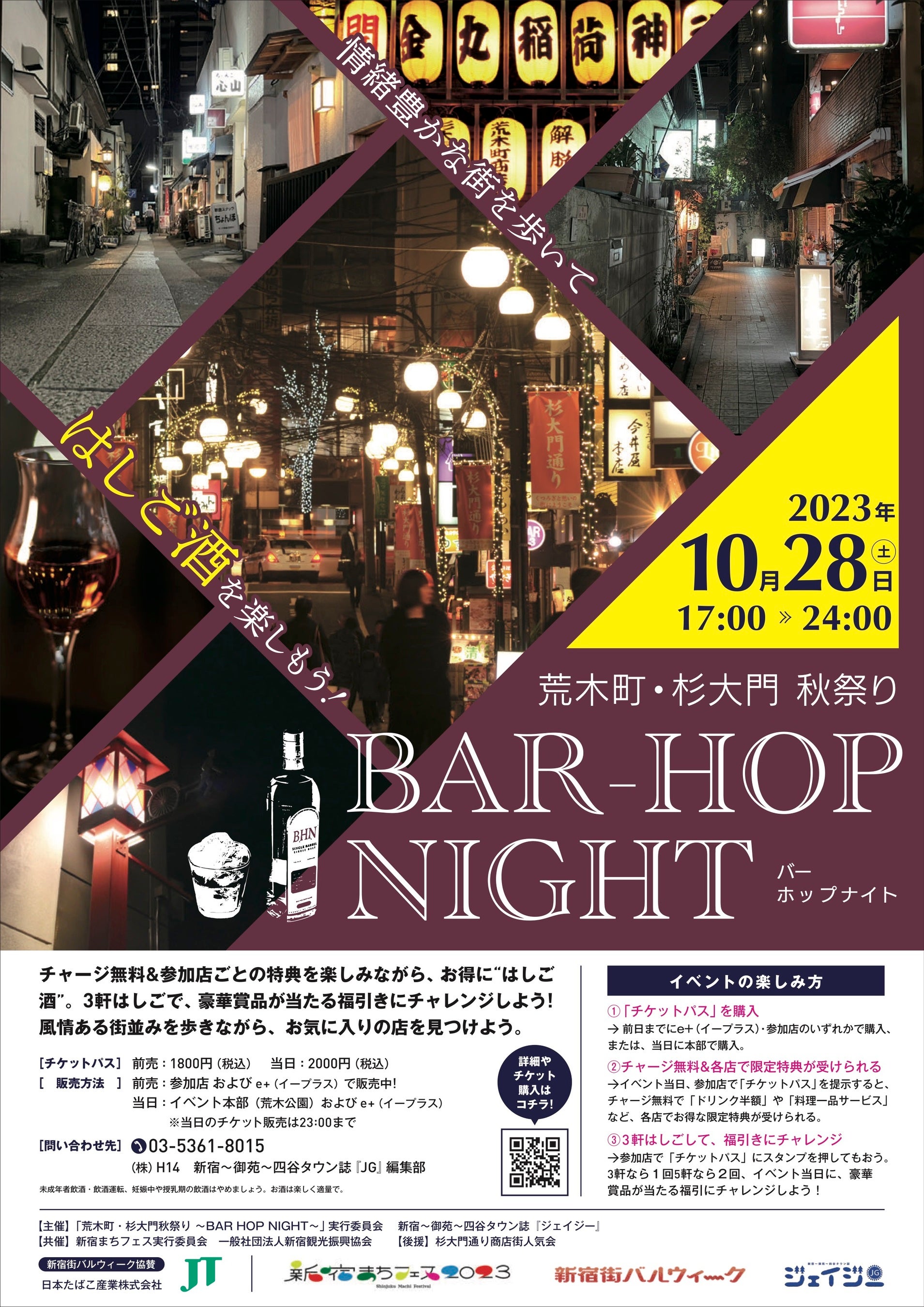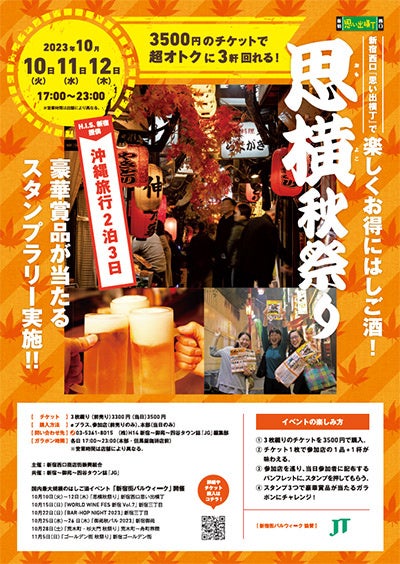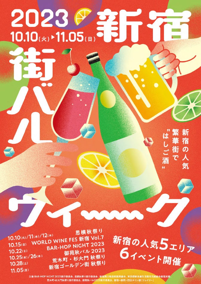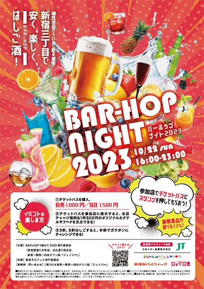 主催:新宿西口商店街振興組合、思横秋祭り実行委員会、御苑秋バル2023実行委員会、荒木町・杉大門秋祭り実行委員会、東京都飲食業生活衛生同業組合新宿支部、BAR-HOP NIGHT2023実行委員会、新宿~御苑~四谷タウン誌『ジェイジー』