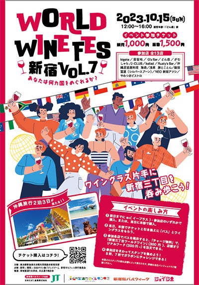 イベントの楽しみ方:チケットパスを提示すると全店チャージ無料、「新宿三丁目ワールドワイン」(300円)や「オリジナルフード」(300円~)を注文できる
