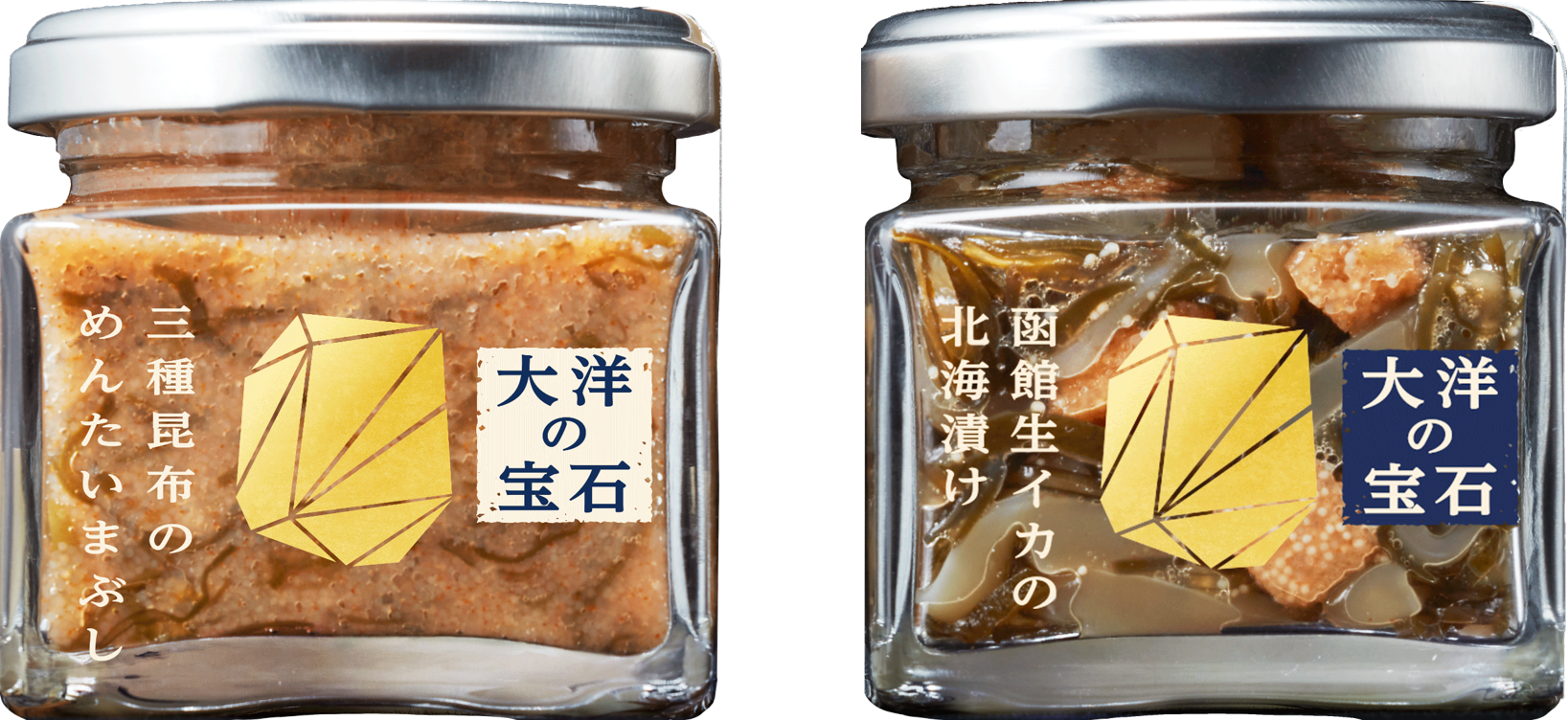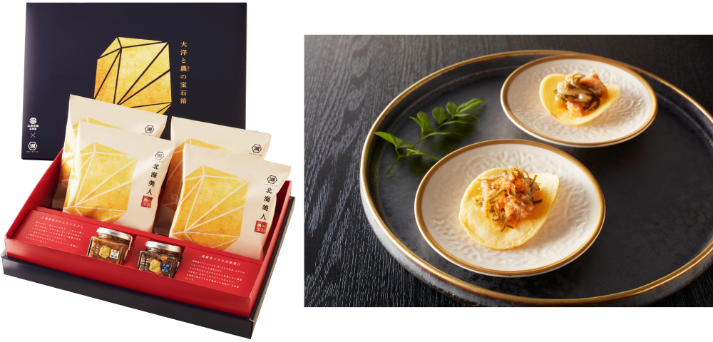 「大洋と農の宝石箱」は、北海道の大地で育てられた湖池屋専用のブランド芋「北海美人」のポテトチップス(農の宝石)とともに、久原本家 北海道が手掛ける北海道の海産物を使った珍味(大洋の宝石)を味わう、北海道の恵みの新しい楽しみ方の提案です。北海道の広大な海と大地で育った素材を最大限に活かし、味作りの技術を注ぎ込み、ここでしか味わえない一品に仕上げました。ひとすくい程の珍味を瓶から取り、ポテトチップスにのせてお召し上がりいただくと、パリパリのじゃがいもとしっとりまろやかな珍味の旨みが口いっぱいに広がります。