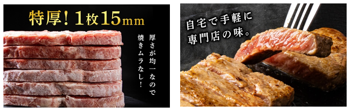 スジと脂身を取り除き、柔らかく加工したサーロイン肉。15mmの厚さで均等にカットしており、均一に焼きあがります。焼き上がりは柔らかくジューシーに仕上がります。