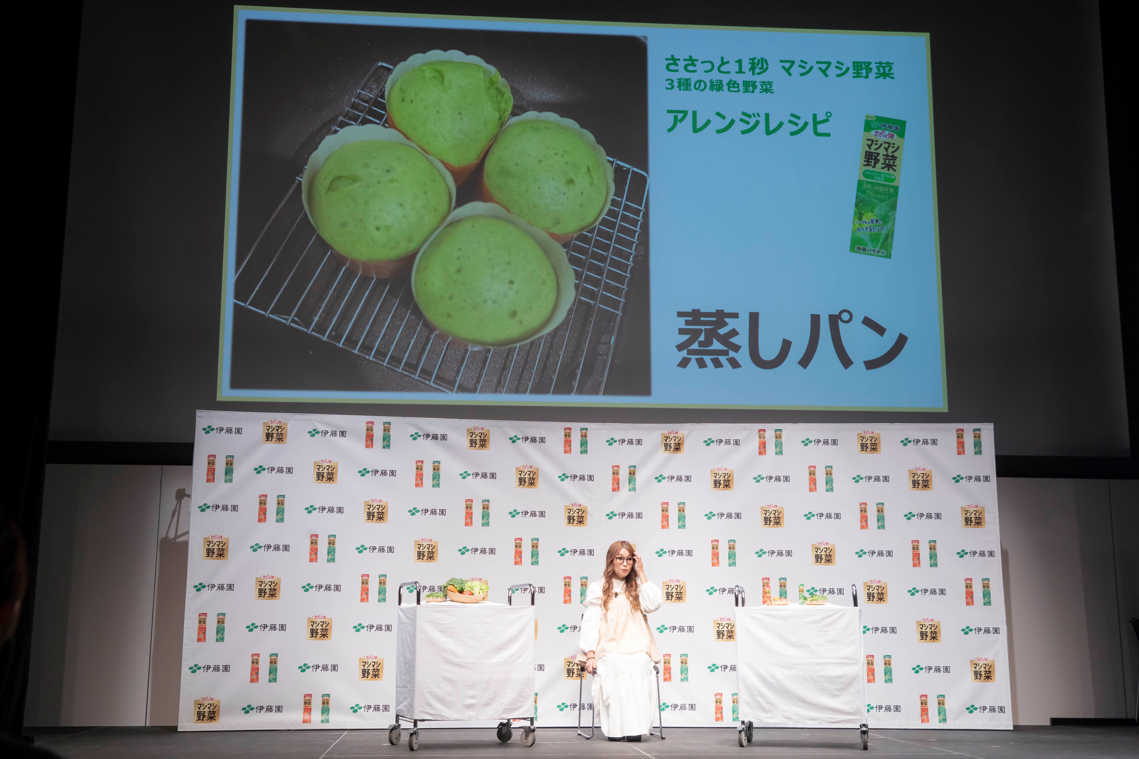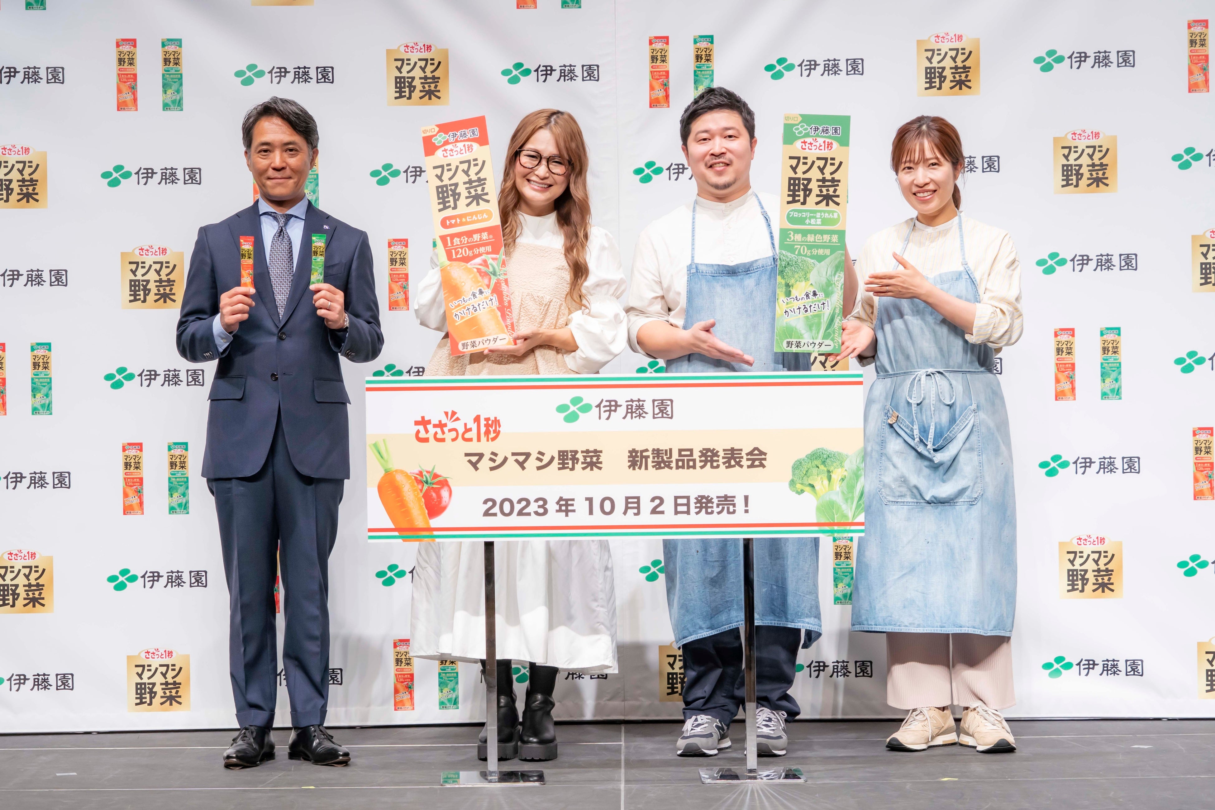 本イベントでは、株式会社伊藤園 マーケティング本部 野菜・果汁・フードブランドグループ ブランドマネジャー 山口哲生より、新製品発売の狙いや背景、新製品コンセプトのご説明をさせていただきました。さらに、特別ゲストとして、野菜100%飲料No.1(※)である「1日分の野菜」のCMキャラクターを務めるタレントのギャル曽根さんにご登場いただき、新製品のコンセプトにまつわるトークセッションや、新製品「ささっと1秒 マシマシ野菜」を使用したアレンジレシピをご紹介いただきました。さらに、料理家のぐっち夫婦さんにも登場いただき、新製品をもとに考案した簡単レシピで作った料理を披露し、ギャル曽根さんに試食していただきました。