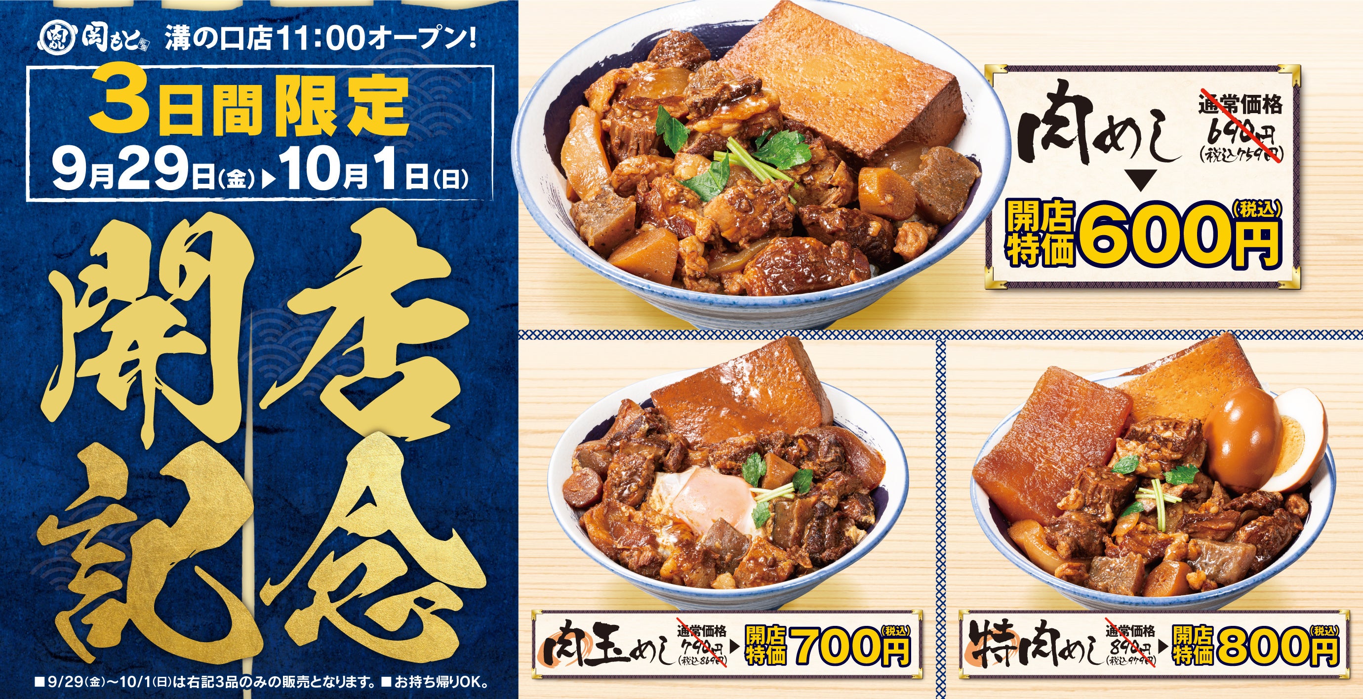 神奈川県初出店となる「肉めし岡もと 溝の口店」では、カツ丼でも牛丼でも親子丼でもない”新しい肉丼”を気軽に味わっていただけるよう、9月29日(金)~10月1日(日)の3日間は看板メニューの「肉めし」をはじめ、代表的な3品をとってもお得な開店特価で販売いたします。