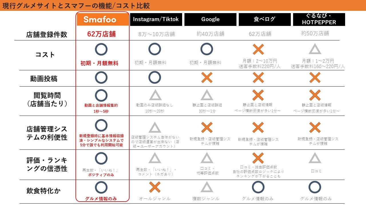さらに、Z世代を含む若年層へのアプローチを強化するための縦型フォーマットの採用や、飲食店の経費削減をサポートする機能を備え、本質的問題を浮き彫りにして、真の飲食店のかかわりを追求と解決を目指す新しいグルメサービスです