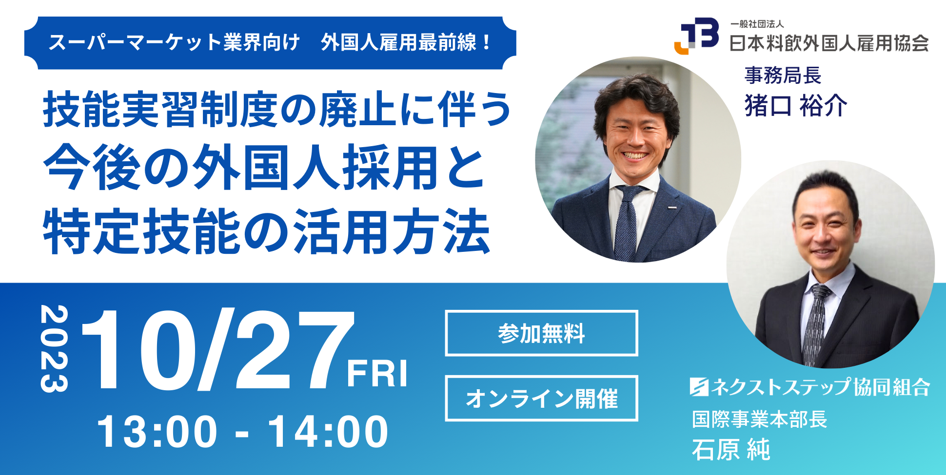 一方で、スーパーマーケットでの外国人雇用に関しては、現行の特定技能の対象分野に該当しておりません。今回開催するセミナーでは、今後も外国人雇用を継続して事業を発展されるためのスーパーマーケット業界の採用の在り方について最新情報を踏まえてお話しします。