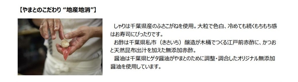 『回転寿司やまと』は1996年、館山に1号店をオープンしました。地元のお客様から観光客まで幅広い支持を得て、千 葉県を中心に店舗展開を進めています。愛され続ける理由は、水産会社直営だからこそ提供できる”本物の旨さ“。創業 40年以上、長年にわたり卸事業を手掛けてきた当社は、漁港との強固な信頼関係が強みです。魚を知り尽くした熟練の 目利きが、漁場で一匹一匹吟味して選別した鮮度抜群の魚介類を、職人が素材に応じた管理と下処理を丁寧に行 い、自然な旨味を堪能できる最高の状態でご提供。仲介流通ルートを省き、自社便配送することで、高品質な魚をお手 頃価格でお楽しみいただけます。評判が評判を呼び、「食べログ」千葉県寿司ランキングで1位常連となった今では、週末 2~3時間待ちとなる店舗も少なくありません。