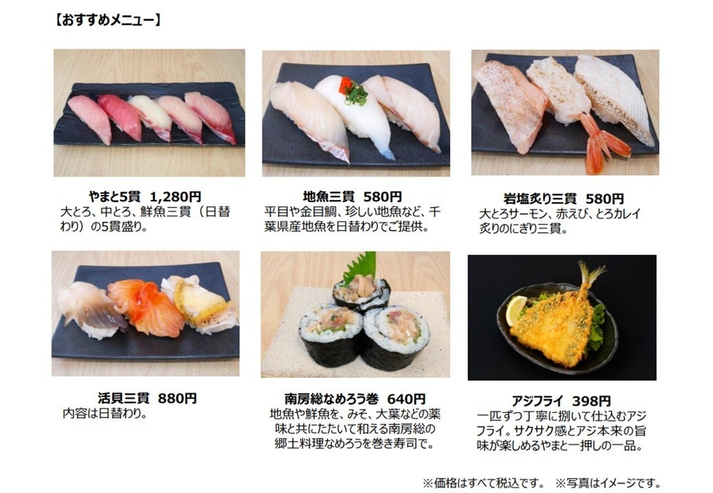 コロナ禍は、飲食店に対する人々の価値観にも変化をもたらし、”本物感“”特別感“といった外食ならではの価値が一 層求められるようになりました。そうしたニーズに応え、ブランドをより強化する旗艦店をつくろうと、この度やまと寿司発祥の 地・館山に新店舗をオープンする運びとなりました。館山夕日桟橋の目の前の立地で、海を見渡せる絶好のロケーション、 天気が良ければテラスから夕日に染まる富士山も望めます。店内は、畳の小上がり席や半個室をご用意し、旅先の旅館 のような寛ぎ感を演出。職人が腕を振るうカウンターでは寿司を握るライブ感を楽しめます。 創業以来こだわり続けるまぐろや地魚の握りはネタも大きく、食べ応え満点。その他、なめろうやアジフライなど自信の一 品料理も揃います。注文した商品は専用レーンでお席まで届きます。家族や仲間と、リゾート気分で房総の海の幸をカジ ュアルに味わう、極上の休日時間を満喫していただけます。