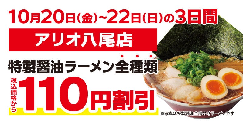 この度オープンを記念して、「アリオ八尾店」にご来店いただいたお客様には、『特製醤油ラーメン全種類』を税込価格から110円割引で販売いたします。