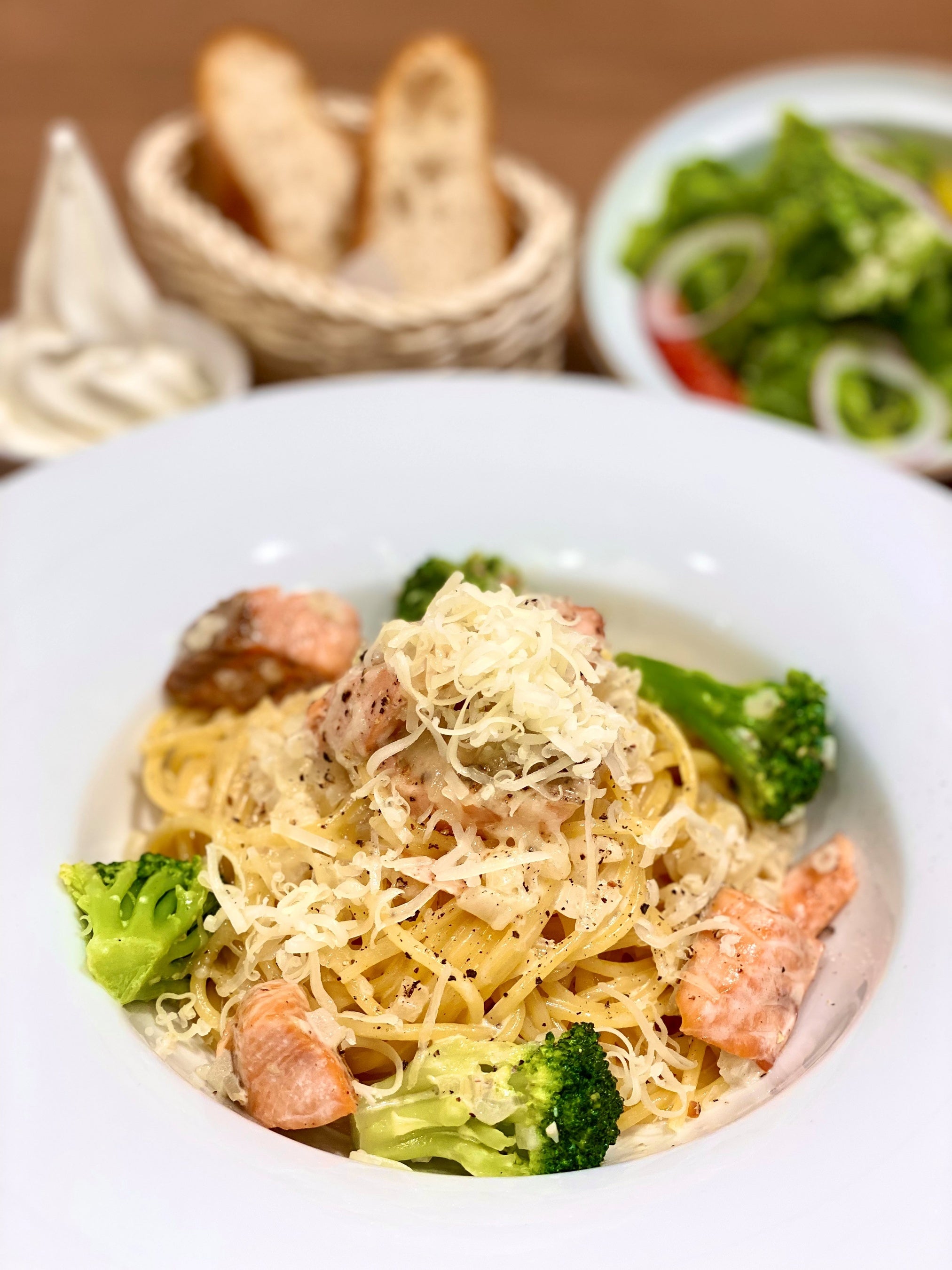 『秋鮭のクリーム&チーズスパゲティ』は、今が旬の北海道産秋鮭の美味しさを感じられるよう、ソースは北海道産カマンベール&ブルーチーズと生クリームをふんだんに使うことでまろやかに仕上げました。まろやかの中に、ブルーチーズのちょっとしたアクセントが加わっているため、一度食べると癖になる一品です。