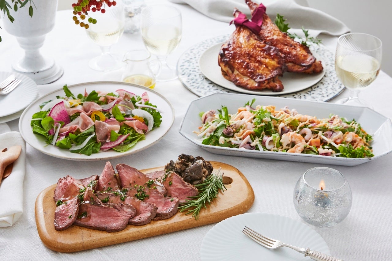 子どもから大人までご家族みんなで楽しめる、RF1の人気商品を含む4品(牛肉のグリル 霜降りひらたけロースト添え/桜島どりのもも肉ロースト/たっぷり海の幸の美味サラダ/北海道産生ハムとルッコラの華やぎサラダ)の詰め合わせ。