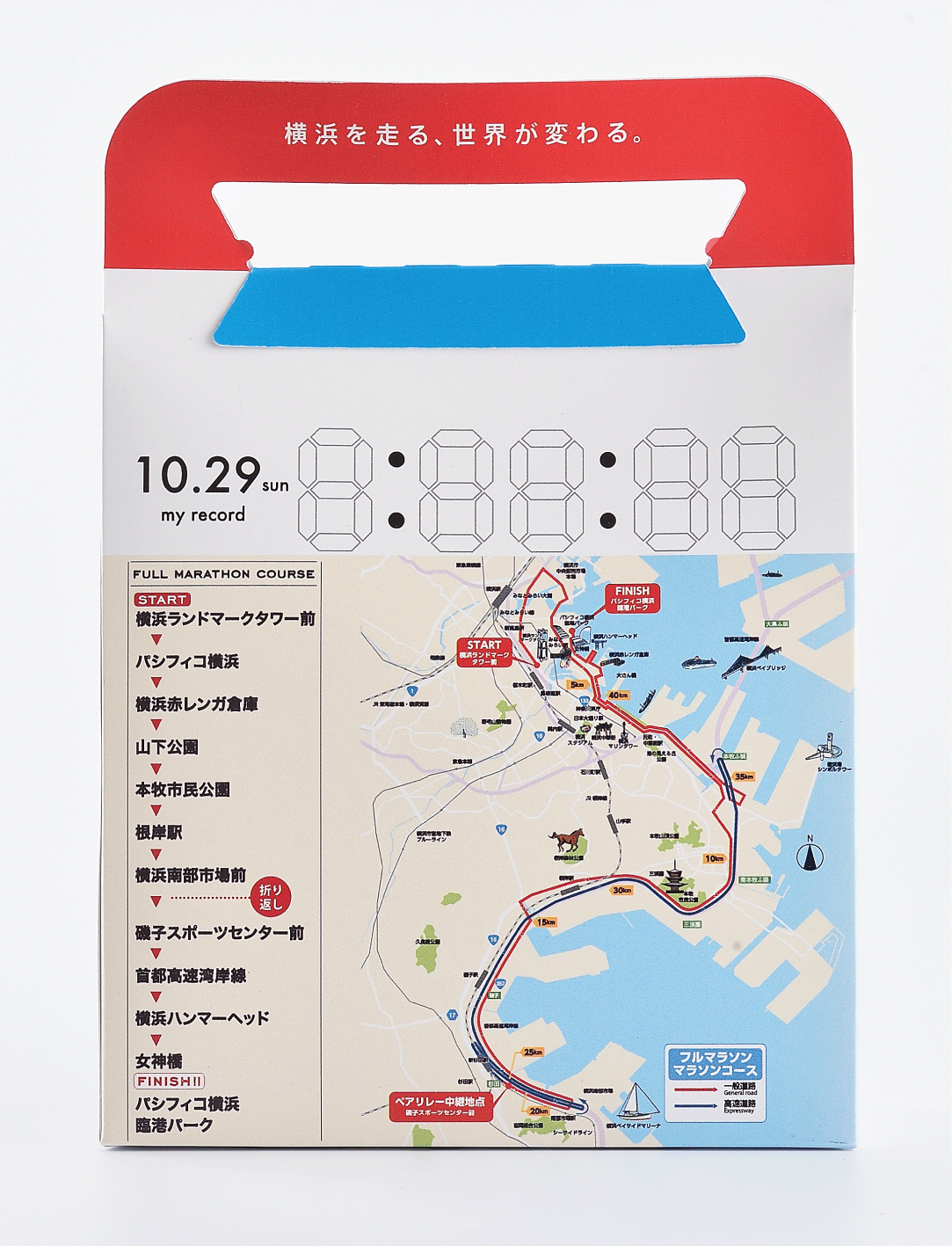 パッケージ裏面にはマラソンコース図が載っており、お土産・マラソン観戦の記念にぴったり。また今年は、大会事務局の公式サービス企画の一環として、参加者の出走記録を自身で記入できる“マイレコード”ステッカー付きです。横浜を思い切り駆け抜けた方、大きな声援を送った方、ボランティアで参加した方など色々な形で横浜マラソンを楽しんだ皆さまの思い出となるパッケージに仕上げました。