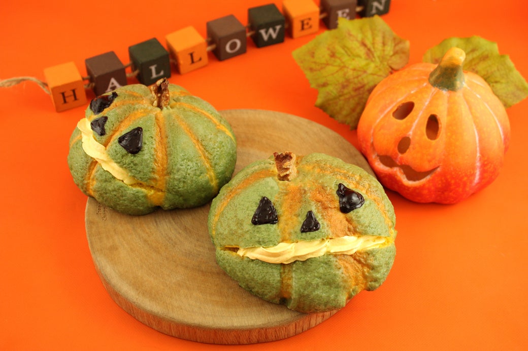 かぼちゃペーストを練り込んだかぼちゃ菓子パンに緑色のクッキーをかぶせ、カスタードホイップを絞り、ジャックオランタンに見立てて焼き上げました。