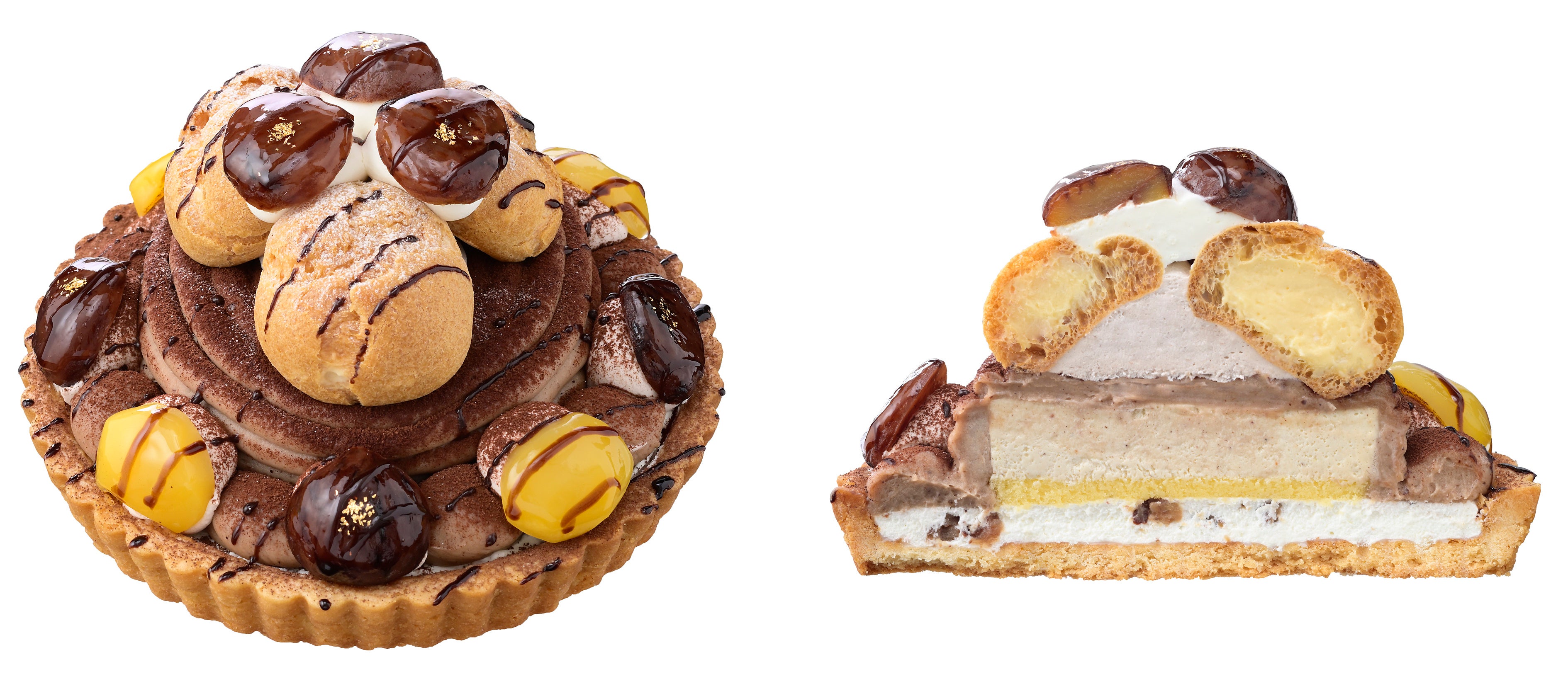 特長:マロンムースにマロンあん、マロンホイップクリームなどを重ねてマロンカスタードクリーム入りシュークリームと栗の甘露煮をのせた、ボリューム満点のタルト。どこを食べてもいろいろな栗の味わいを楽しめる、栗好きさんのためのタルトです。