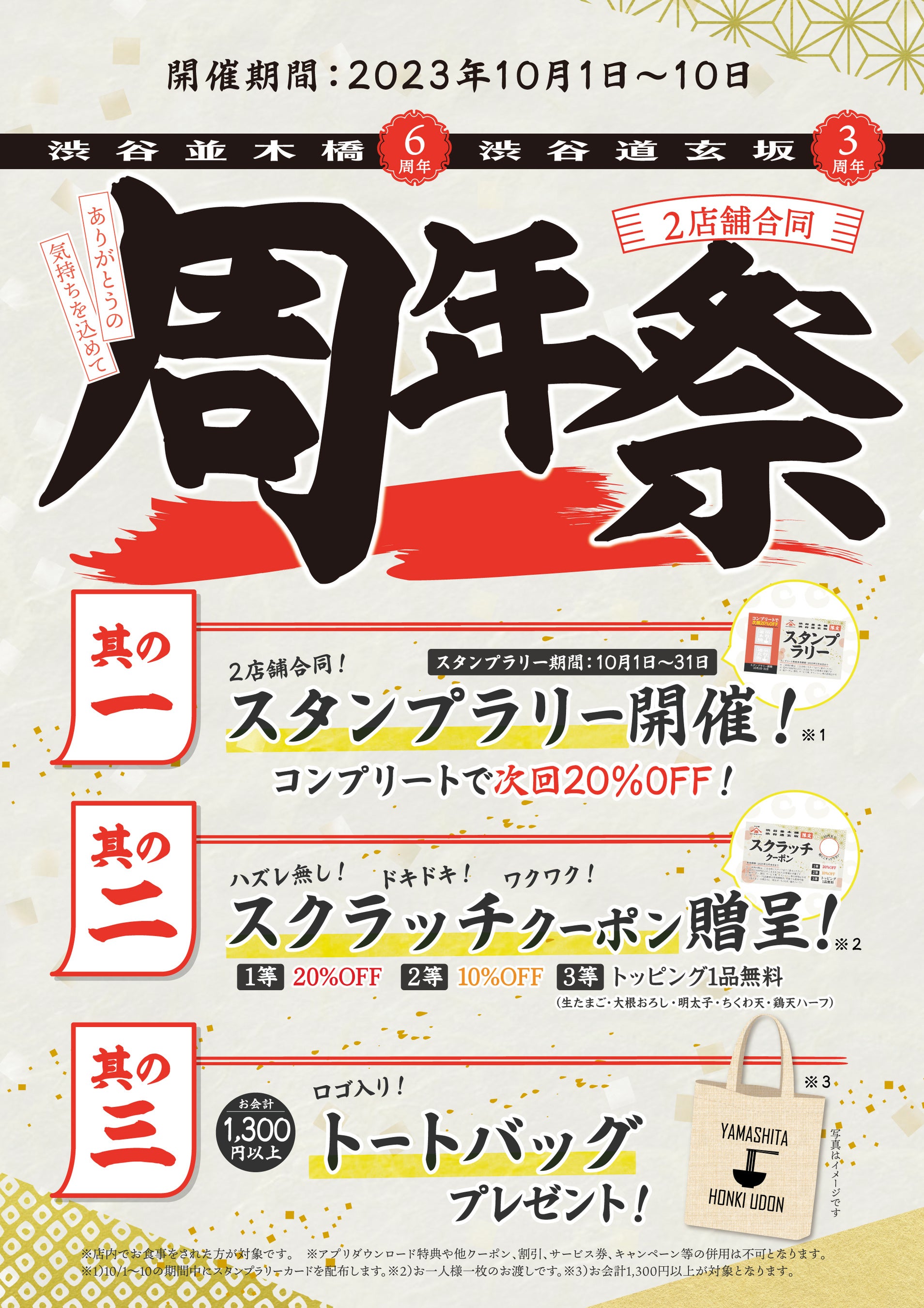 期間中に「山下本気うどん 渋谷並木橋」と「山下本気うどん 渋谷道玄坂」にそれぞれにご来店いただくと、3回目の来店で、20%引きになる「2店舗制覇で20%引きスタンプラリー」※1の配布や、削って楽しい最大20%引きのクーポンがもらえる「周年祭限定スクラッチクーポン」※2を実施いたします。また、「山下本気うどんロゴ入りトートバッグ」※3をプレゼントいたします。