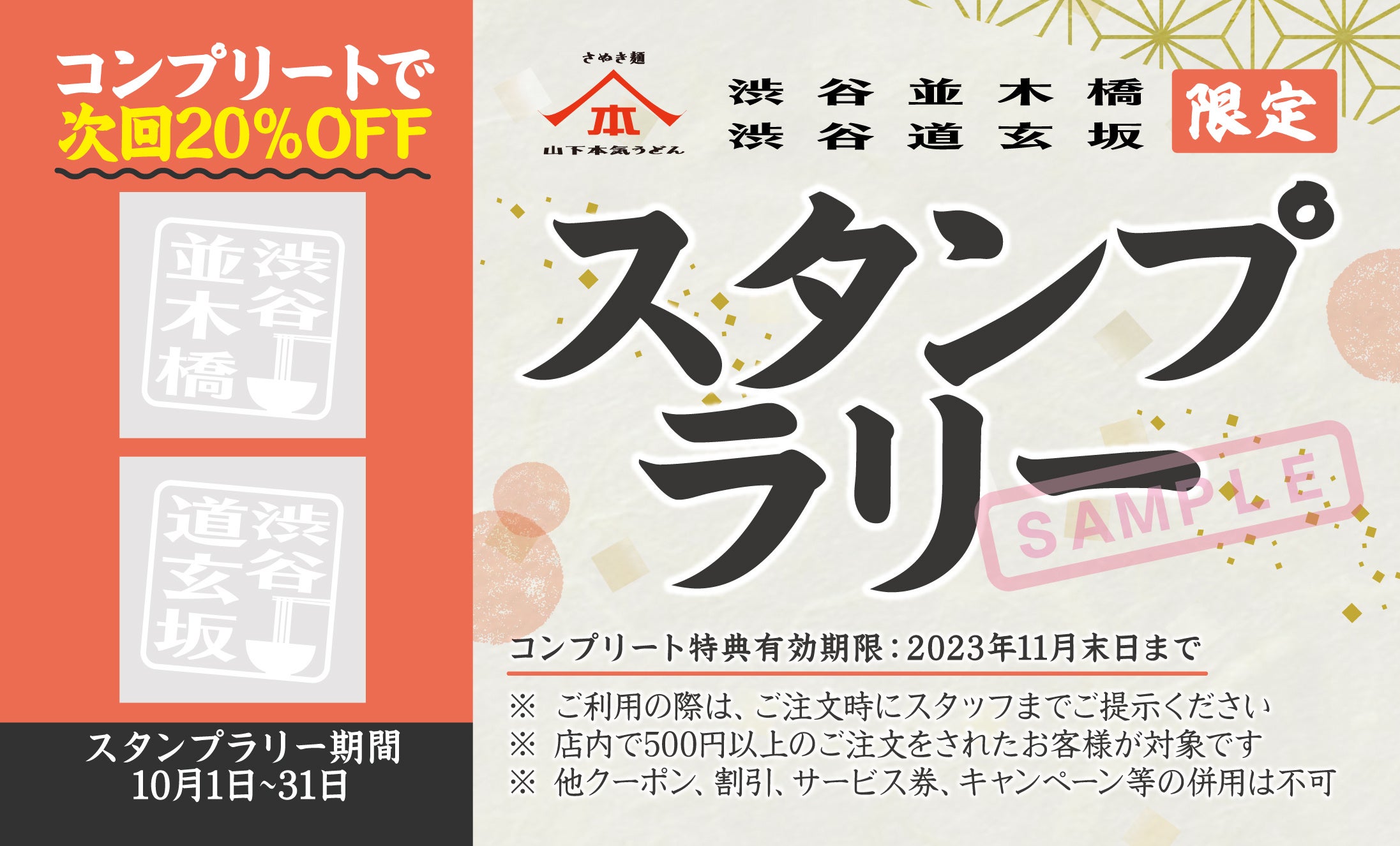 「山下本気うどん 渋谷並木橋」と「山下本気うどん 渋谷道玄坂」の各店舗ご利用時にスタンプをそれぞれ集めていただくと、3回目にご来店いただいた際に、山下本気うどん全商品が20%引きになるというスタンプラリーを実施いたします。