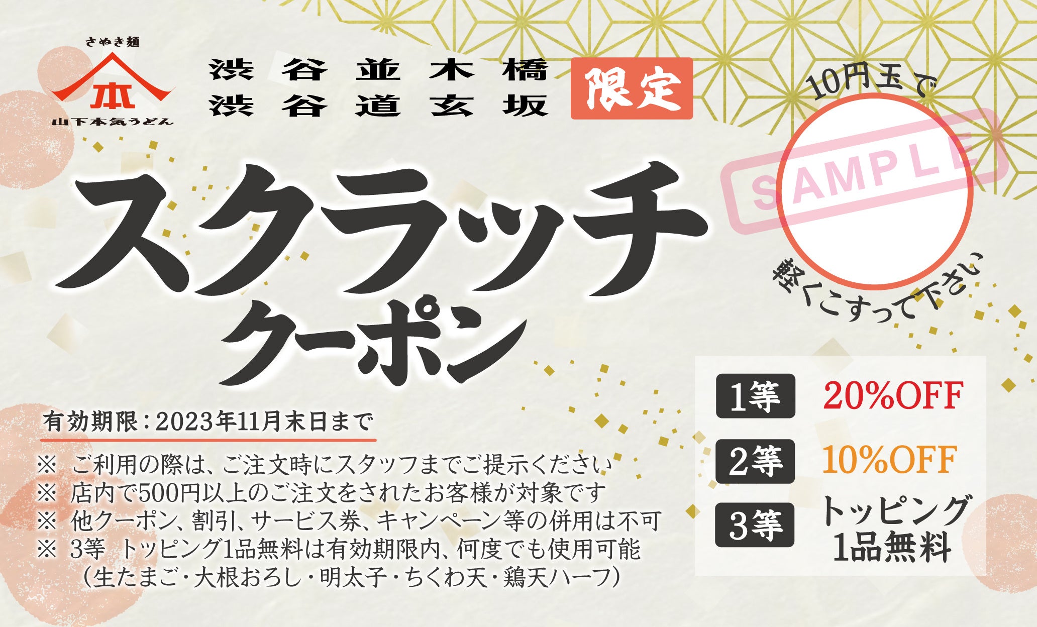「山下本気うどん 渋谷並木橋」または「山下本気うどん 渋谷道玄坂」にご来店いただいた方限定で、周年祭限定のスクラッチクーポンに挑戦することができます。削るまで何が当たるかわからないワクワク感をぜひお楽しみください。
