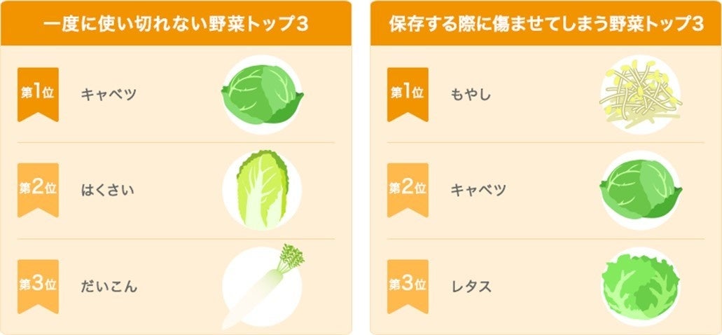 最も廃棄されやすい食品カテゴリーは生鮮野菜で33.6%という結果に。さらにその中でも一度に使いきれない野菜、保存する際に傷ませてしまう野菜を調査しました。一度に使いきれない野菜は1位「キャベツ」、2位「はくさい」、3位「だいこん」、保存する際に傷ませてしまう野菜は1位「もやし」、2位「キャベツ」、3位「レタス」と、どちらの項目でもキャベツが上位にランクインしており、調理・保存が難しい野菜であることがわかります。葉物野菜は購入時の量の調節や長期保存することが難しいことが要因であると考えられます。