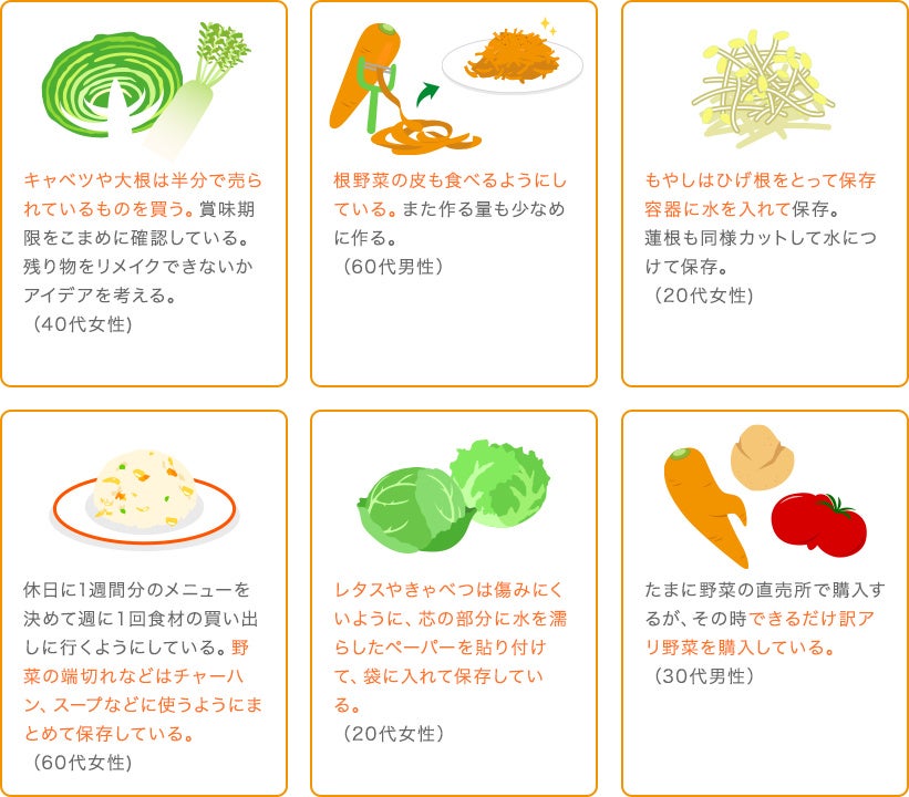 野菜好き、また「食品ロス削減」を意識している人は、野菜を食べる分だけ買うような意識をしている他、調理する際に可食部を無駄なく使うレシピや調理法の考案・実践、長期的に鮮度を保てるような保存方法の工夫を率先しておこなっていることがわかりました。