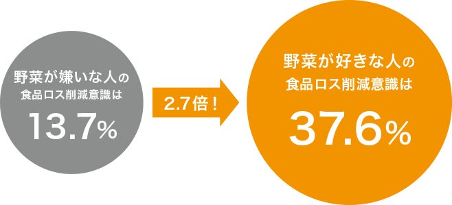 食品ロス削減について意識あり(そう思う)と回答した割合は、野菜が嫌いな人は13.7%なのに対し、野菜が好きな人は37.6%と約3倍も高いことが明らかに。