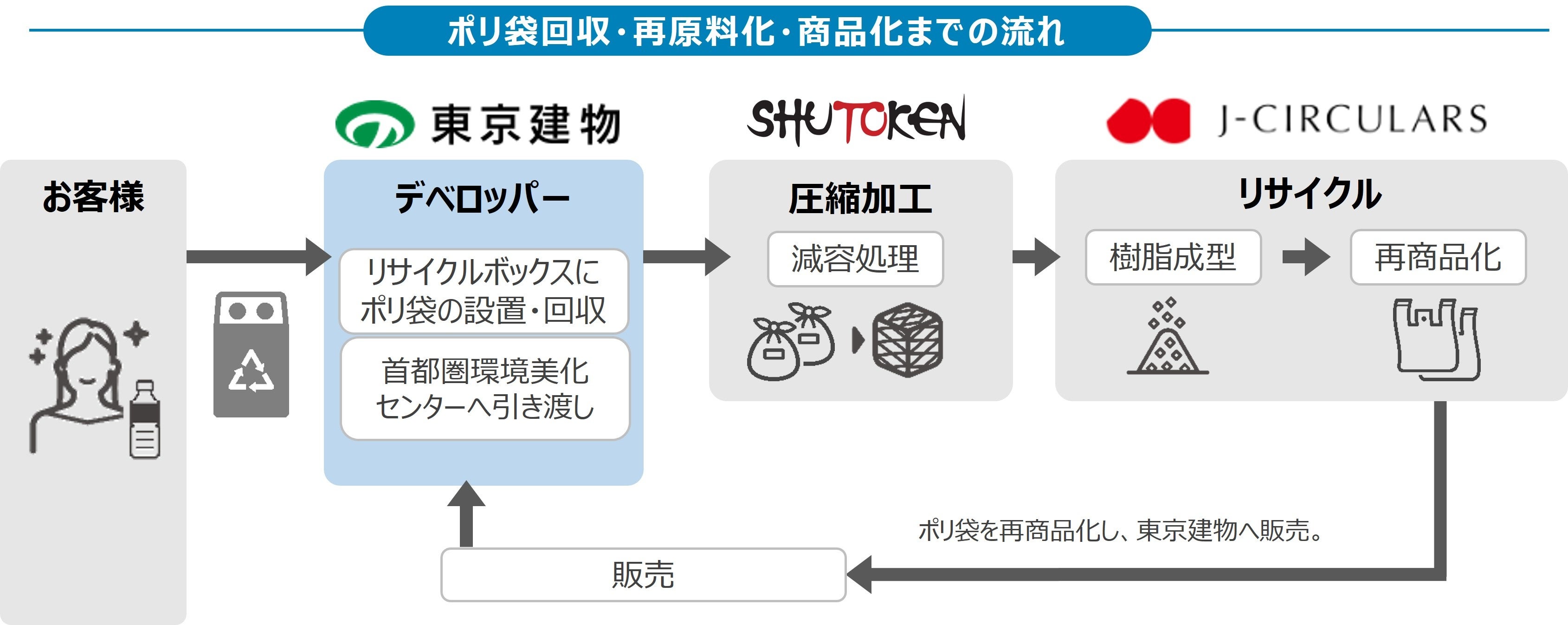 本取り組みでは、東京建物が中野セントラルパーク内に設置しているリサイクルボックスから使用済みペットボトルを回収し、株式会社首都圏環境美化センター(社長 斉京由勝、以下首都圏環境美化センター)にてペットボトルの中間処理を行い、リサイクラーである豊通ペットリサイクルシステムズ株式会社(社長 小坂彦二)に供給した上で、キリンビバレッジが再原料化・再生PETを使用した容器の飲料の製造を行います。また、リサイクルボックスで使用したポリ袋は首都圏環境美化センターで中間処理を行った後、J-CIRCULARS株式会社(社長 下別府正樹、以下J-CIRCULARS)が樹脂成型とポリ袋の製造を行った上で、東京建物へ納品します。