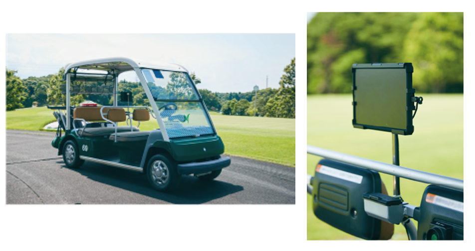 都圏近郊の良質なゴルフ場にあるゴルフカート後部座席に設置されたデジタルサイネージです。