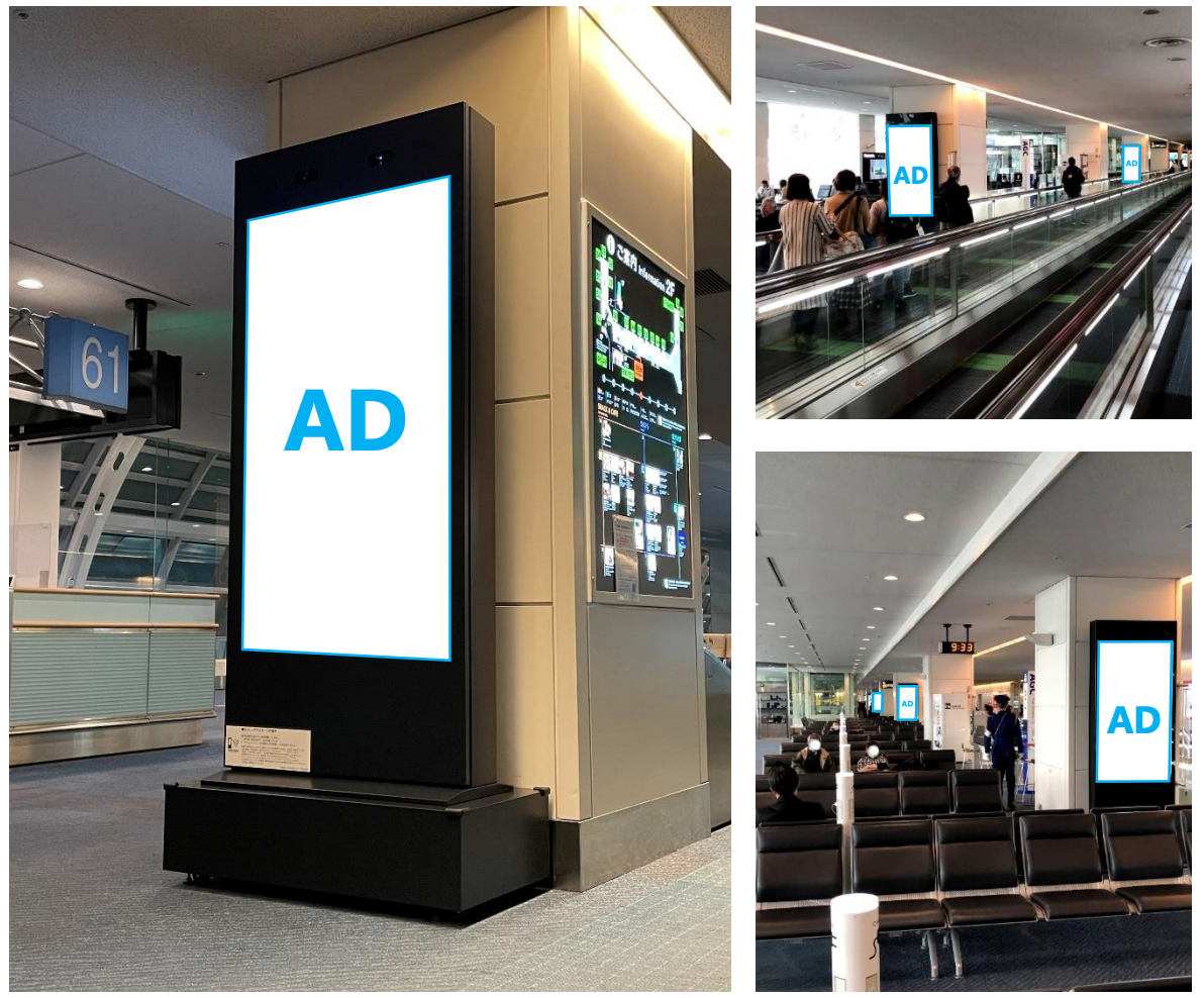 国内空港のデジタルサイネージを結ぶネットワークにより、素材1つで、国内9空港・合計46台のデジタルサイネージで優良な「トラベラー」へのアプローチが可能です。さらにAIカメラによる視認率・属性の計測も可能です。