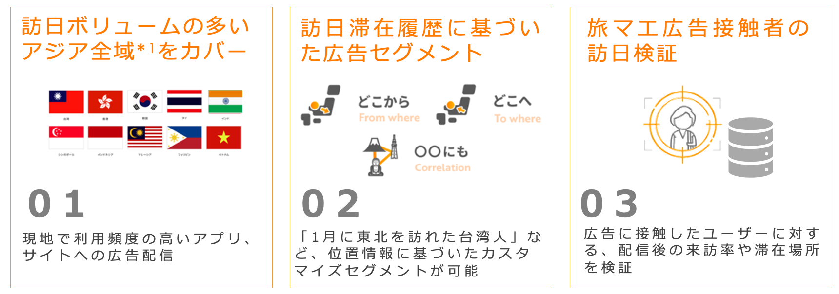 訪日ボリュームの多いアジア全域をカバーしており、現地で利用頻度の高いアプリ、サイトへの広告配信や訪日滞在履歴に基づいた広告セグメントが可能です。