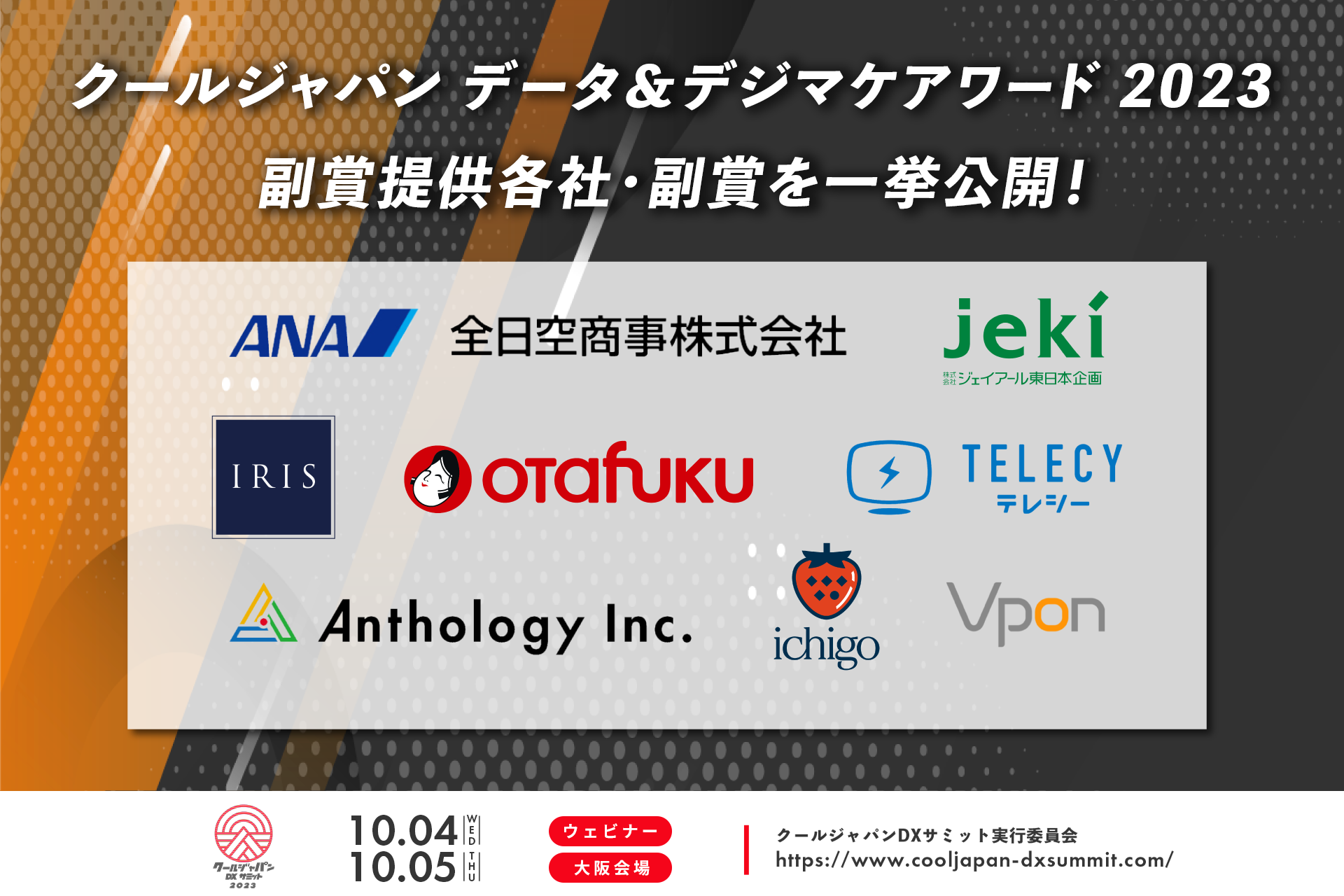 クールジャパンDXサミット実行委員会(運営事務局:Vpon JAPAN株式会社、本社:東京都新宿区、代表取締役社長:篠原 好孝、以下Vpon JAPAN)は、2023年10月4日(水)~10月5日(木)に開催するクールジャパンDXサミット2023において、5日(木)に大阪会場で開催する「クールジャパン データ&デジマケアワード2023」のアワード副賞が出揃いましたのでご紹介します。
