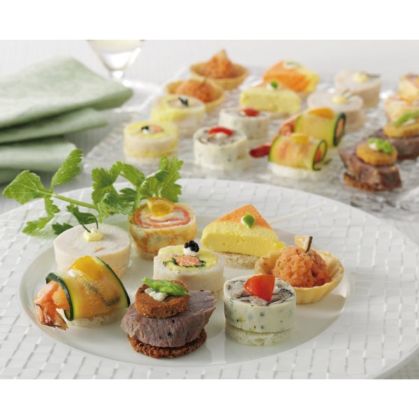 ドイツ政府迎賓館元総料理長によるオリジナルレシピでつくり上げた森のきのこのテリーヌ、バジリコサーモン巻きなど、目にも鮮やかなひと口サイズのフィンガーフードです。