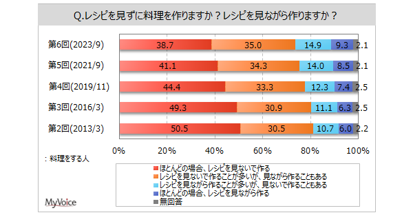 料理をする人のうち、レシピを見ないで作ることが多い人は7割強となっています。「ほとんどの場合、レシピを見ないで作る」は38.7%、過去調査と比べて減少傾向です。