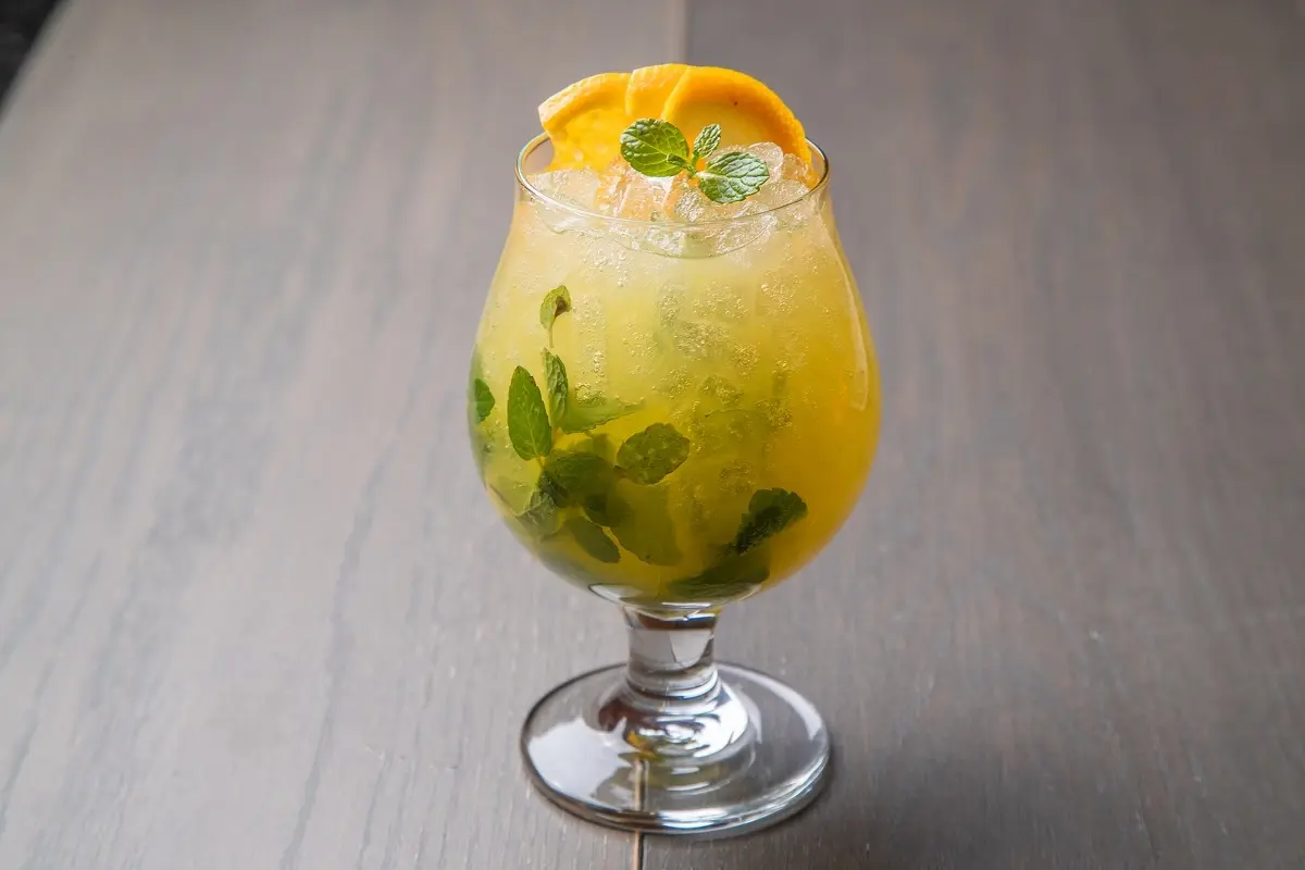 左から「三ケ日みかんモヒート」「アメリカンハイボール」「瀬戸内レモンサワー」「真鱈のフィッシュ&チップス」「大山鶏の瀬戸内レモンクリーム煮」「USリブアイロールステーキ」