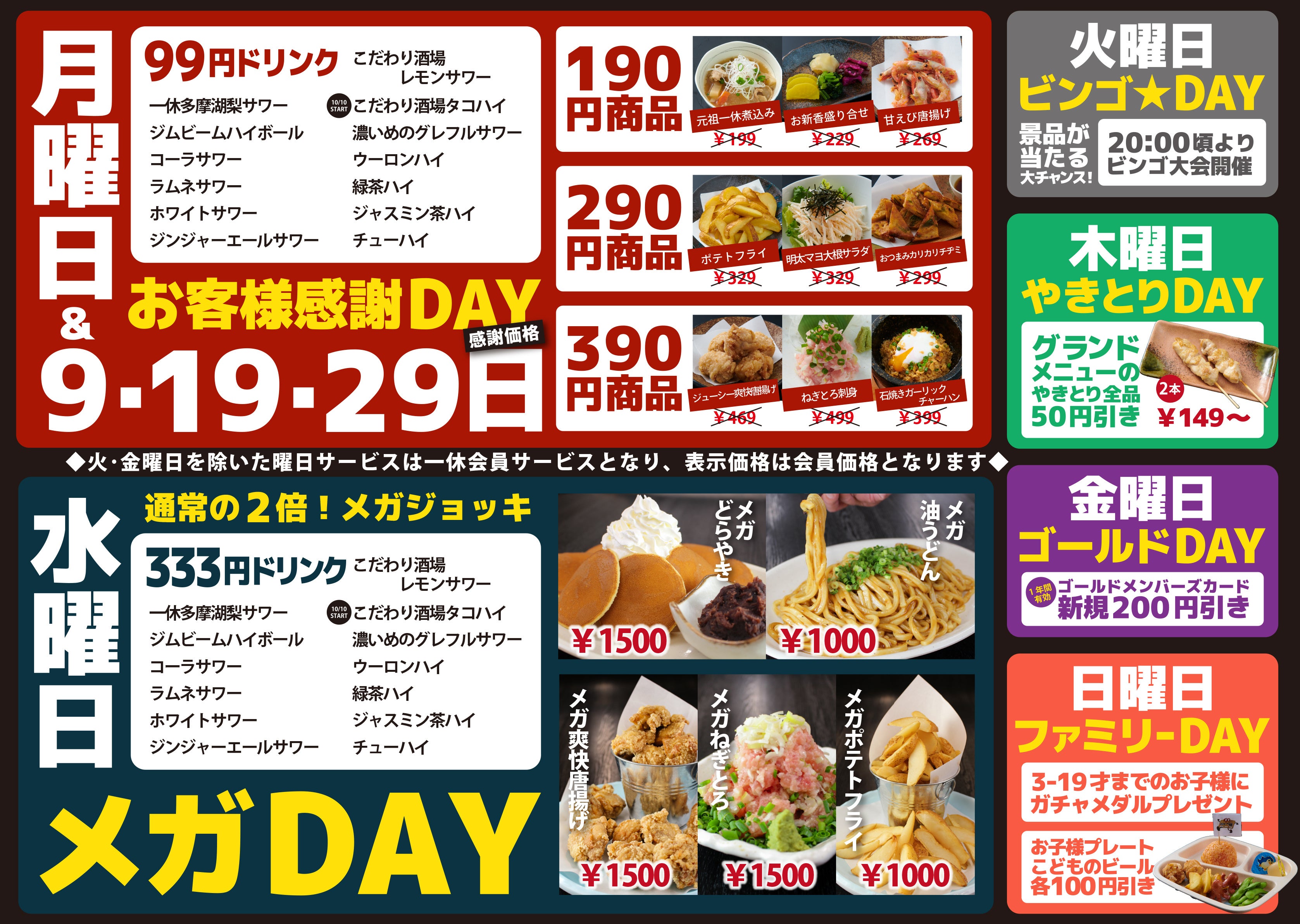 月曜日&9のつく日: お客様感謝DAY 99円ドリンクオールタイム、おつまみ特別価格
