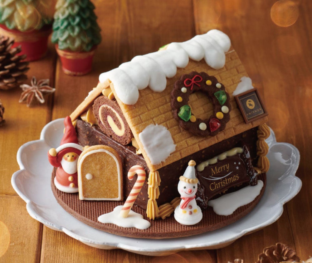 チョコレートケーキとクッキーでつくられた、サンタのお菓子の家。チョコアーモンドスポンジとコクのあるバタークリームを 8 層に重ねた、カラメルが香るチョコレートケーキに小さなブッシュ・ド・ノエルや、クッキーの屋根をのせました。すべて食べられるスイートなお家を囲んで、すてきなパーティーをお過ごしください。