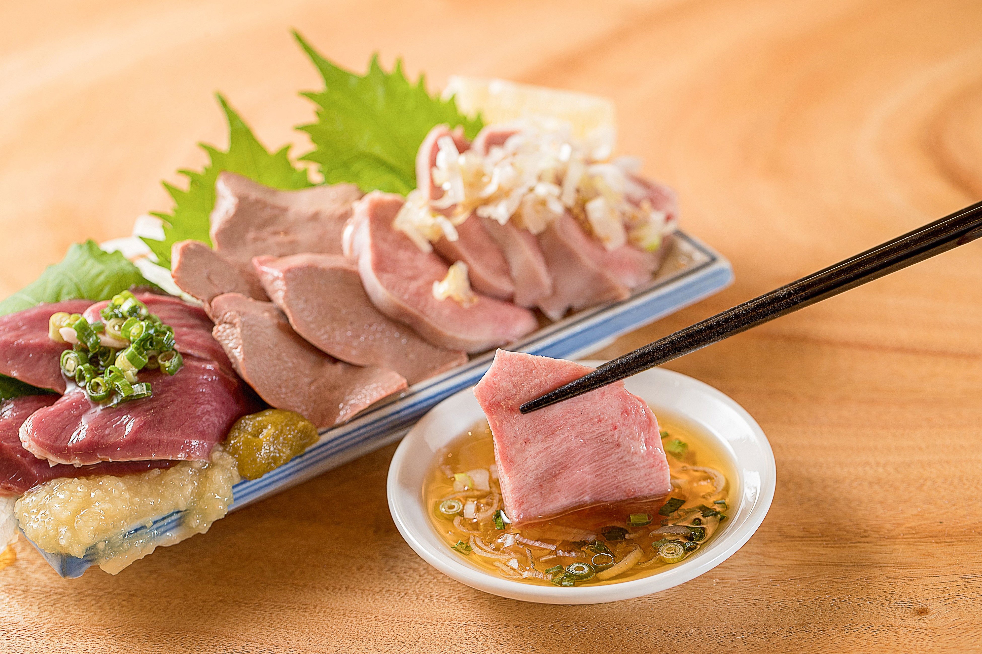 新鮮なモツ刺しは全くといっていいほど臭みがなく、独自の真空技法によってプリプリとした弾力がある自慢の一品。