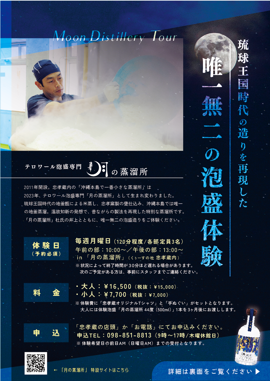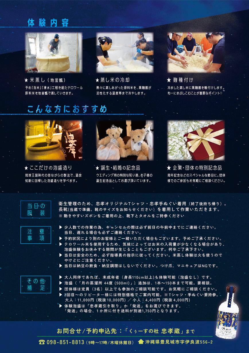 ※体験費に「忠孝蔵オリジナルTシャツ」と「手ぬぐい」がセットとなります。大人には体験泡盛「月の蒸溜所 44度(500ml)」1本を3ヶ月後にお渡しします。