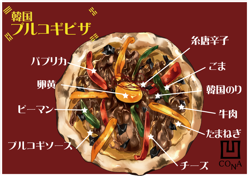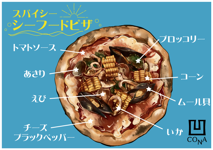 『韓国プルコギピザ』はプルコギの甘辛い味付けをした牛肉と野菜のピザ。『シーフードピザ』はケイジャンスパイスの味付けをした海鮮が乗っかっており少しスパイシーなピザとなっております。双方のピザどちらも見た目も味もダイナミックなピザとなっております。またこちらはライセンス店でも同時販売を行いますので全国のCONAで楽しめるピザとなっております。