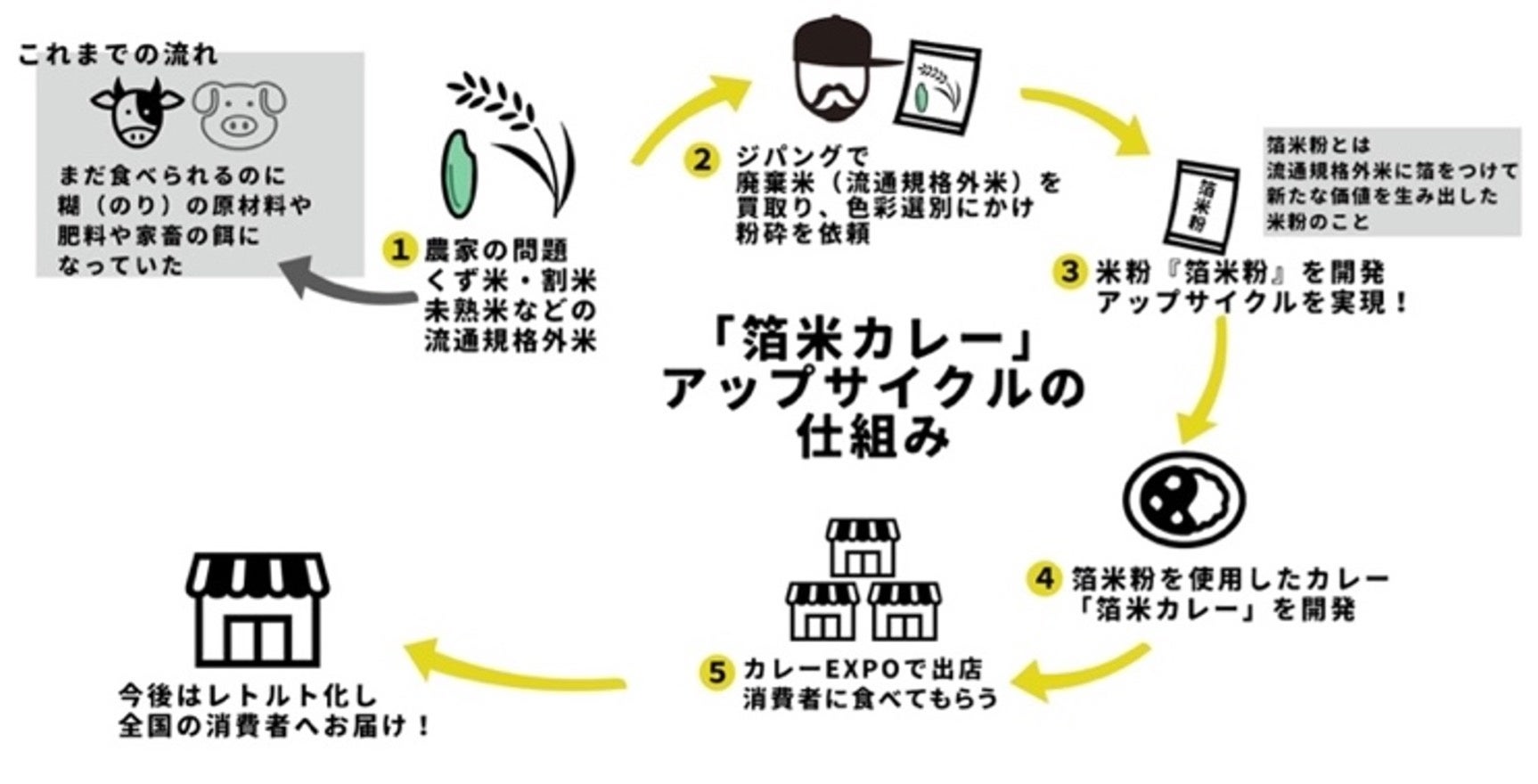 株式会社ジパングフードリレーションズ(本社:大阪市北区、代表取締役:安藤育敏)は、廃棄米(規格外米)をアップサイクルさせて作る特別な米粉を開発し、使用した『箔米カレー』のレトルトカレーを10月1日(日)AM11:00より、店舗、通販サイト、量販店での、販売を開始します。