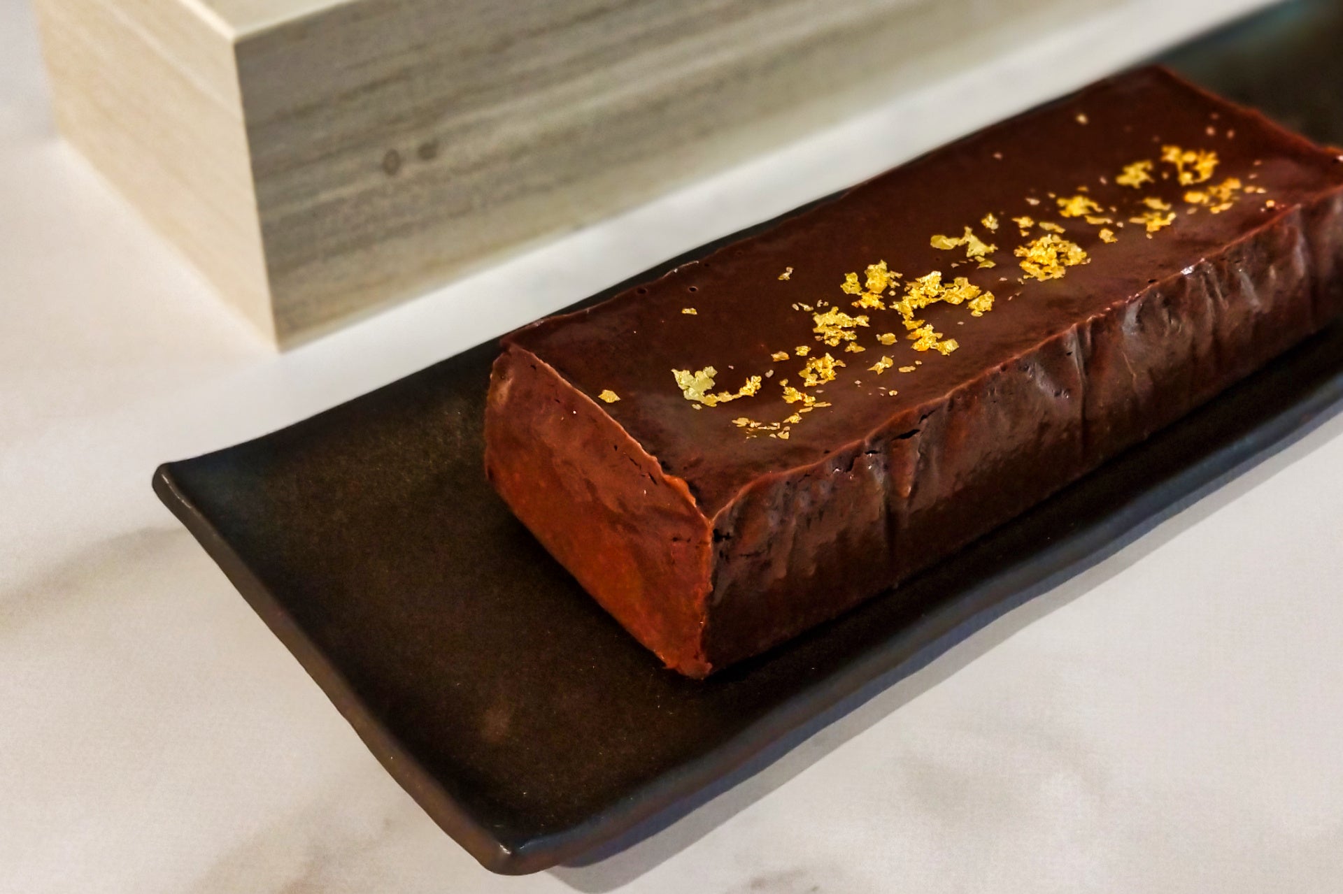 「久留米テリーヌ」は、金箔がちりばめられたリッチなテリーヌショコラと、久留米の伝統工芸品「久留米絣」がセットになったもの。